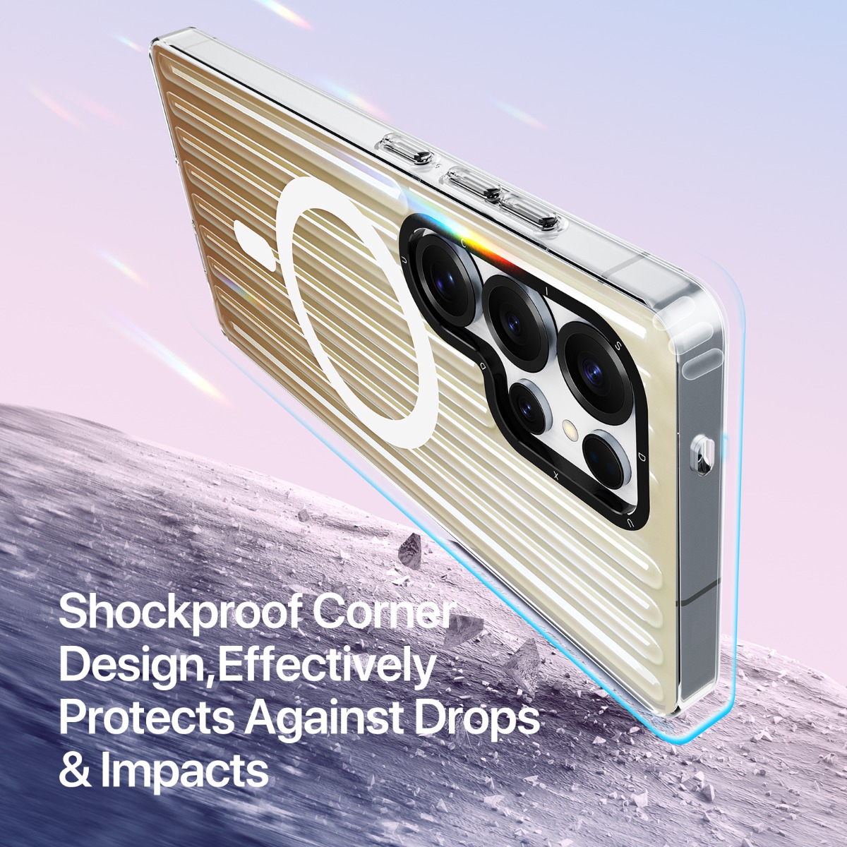 Auksinis dėklas telefonui Samsung S938 S25 Ultra suteikia aukštą apsaugą ir stilių. Medžiaga: PET + TPU + PC + magnetas.