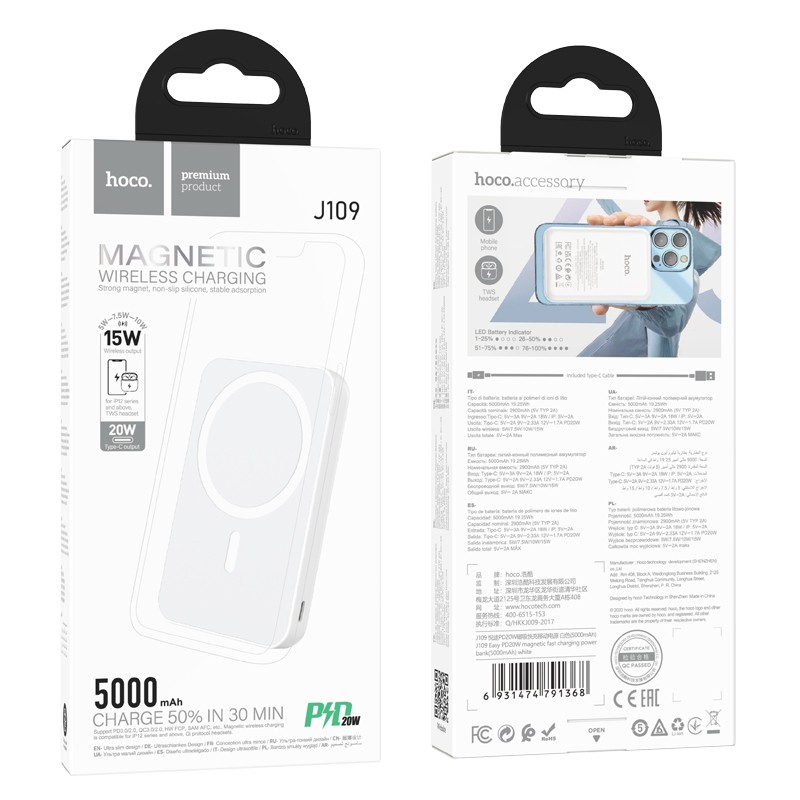 Balta išorinė baterija Power Bank Hoco J109 PD20W Magnetic 5000mAh yra puikus pasirinkimas, kai reikia patikimo energijos šaltinio. 1. Talpa: 5000mAh 19,25Wh