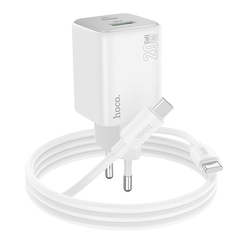 Baltas įkroviklis Hoco N41 20W GaN USB-A / USB-C + USB-C to USB-C cable 1.0m yra efektyvus ir patikimas įkrovimo sprendimas. Šis baltas įkroviklis Hoco pasižymi modernia GaN technologija, užtikrinančia greitą ir saugų energijos tiekimą.