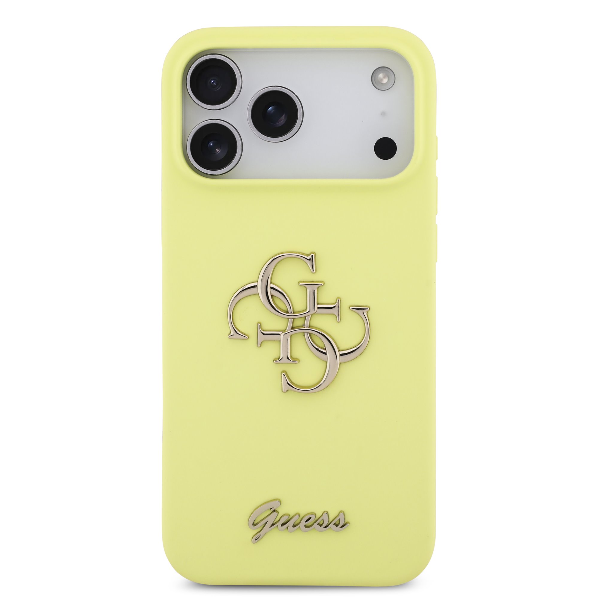 Geltonas dėklas iPhone yra originalus Guess Liquid Silicone 4G Metal Logo aksesuaras Apple iPhone 17 Pro Max telefonui. Pagrindinės savybės: