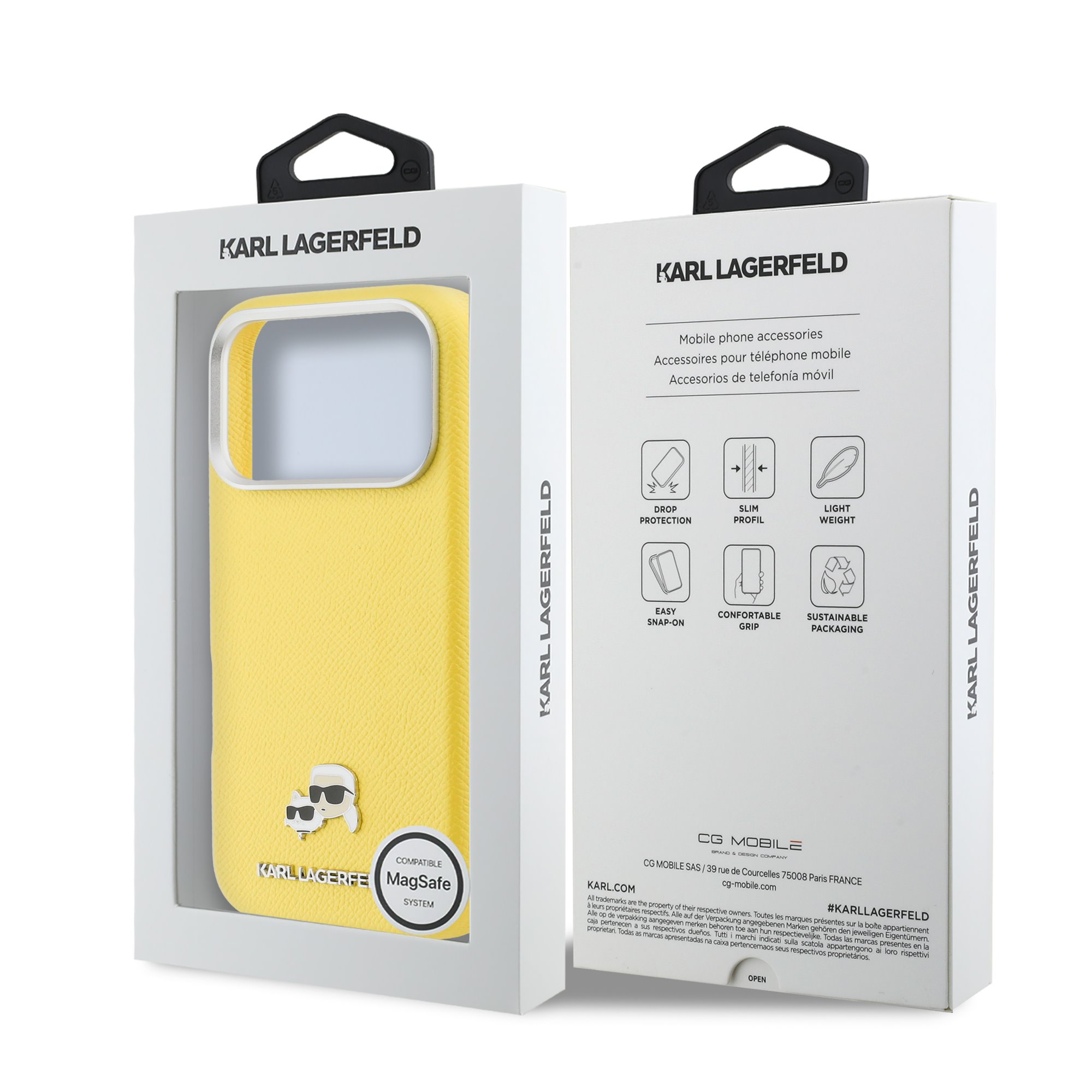 Geltonas originalus dėklas Karl Lagerfeld PU Karl and Choupette Heads Pins MagSafes telefonui Apple Iphone 17 Pro