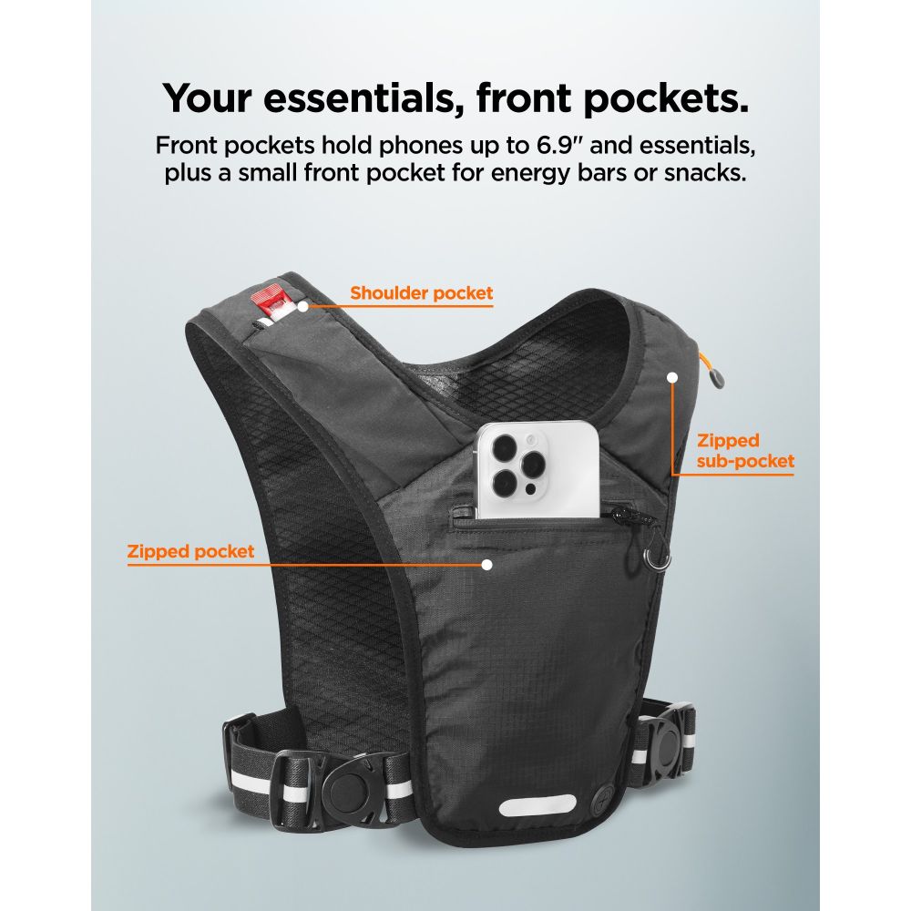 Priekinėje kišenėje telpa iki 6,9 colio dydžio išmanieji telefonai, o galinėje kišenėje su įmontuotu raktų segtuku saugiai tilps piniginė, raktai ir energiniai geliai, nerizikuojant, kad jie iškris ar šokinės bėgimo metu.