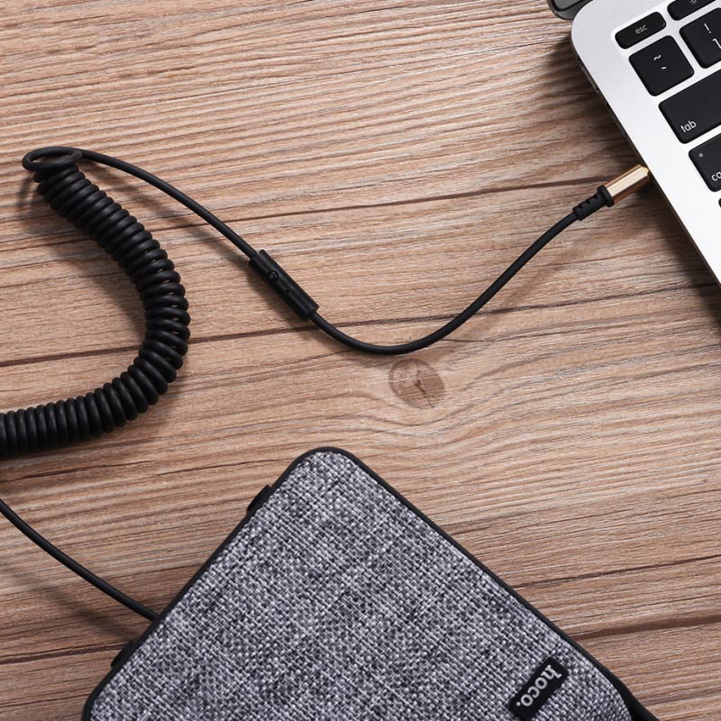 Juodas audio adapteris Hoco UPA02 AUX 3,5mm į 3,5mm su mikrofonu suderinamas su visais 1,8 (3,5 mm) garso sąsajos įrenginiais.