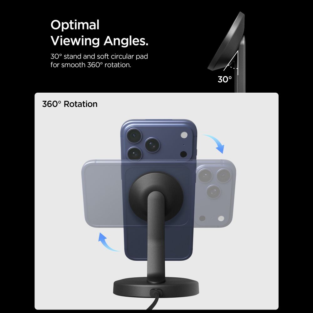 Galimybė išmanųjį telefoną pastatyti tiek vertikaliai, tiek horizontaliai leidžia naršyti turinį, skambinti vaizdo skambučiais ar transliuoti vaizdo įrašus tuo pačiu metu įkraunant. Ergonomiškas stovas su fiksuotu 30° pakreipimo kampu suteikia patogų žiūrėjimo kampą, optimalų žinutėms skaityti, socialiniams tinklams naršyti ar vaizdo įrašams žiūrėti.