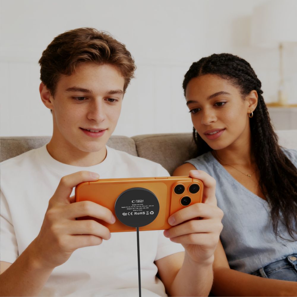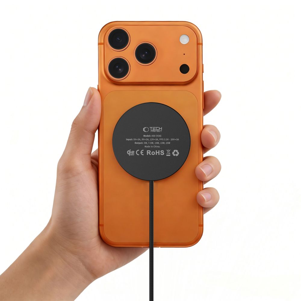 „Tech-Protect A50“ yra kompaktiškas indukcinis įkroviklis su „MagSafe“ magnetiniu laikikliu, palaikantis naujausią „Qi2.2“ standartą, kurio maksimali galia yra 25 W.