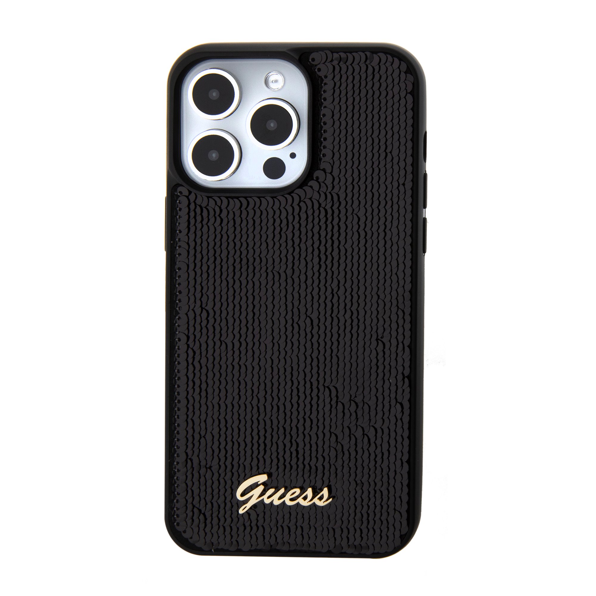 Juodas blizgantis originalus dėklas Guess Sequin Script Logo telefonui Apple iPhone 15 Pro