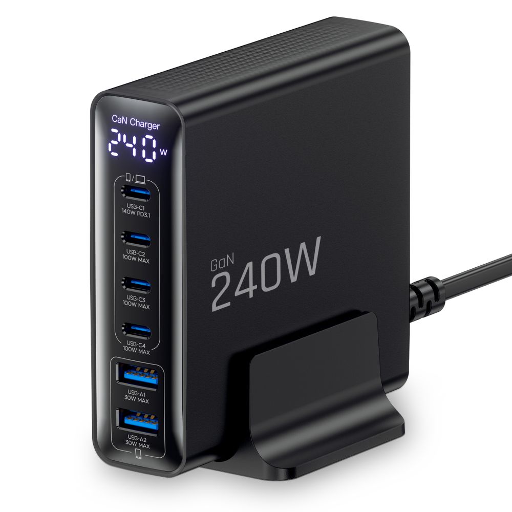 „Tech-Protect DC240W-GaN“ yra galingas stalinis įkroviklis su 6 prievadais (4 USB-C ir 2 USB-A), kurių bendra galia siekia iki 240 W.