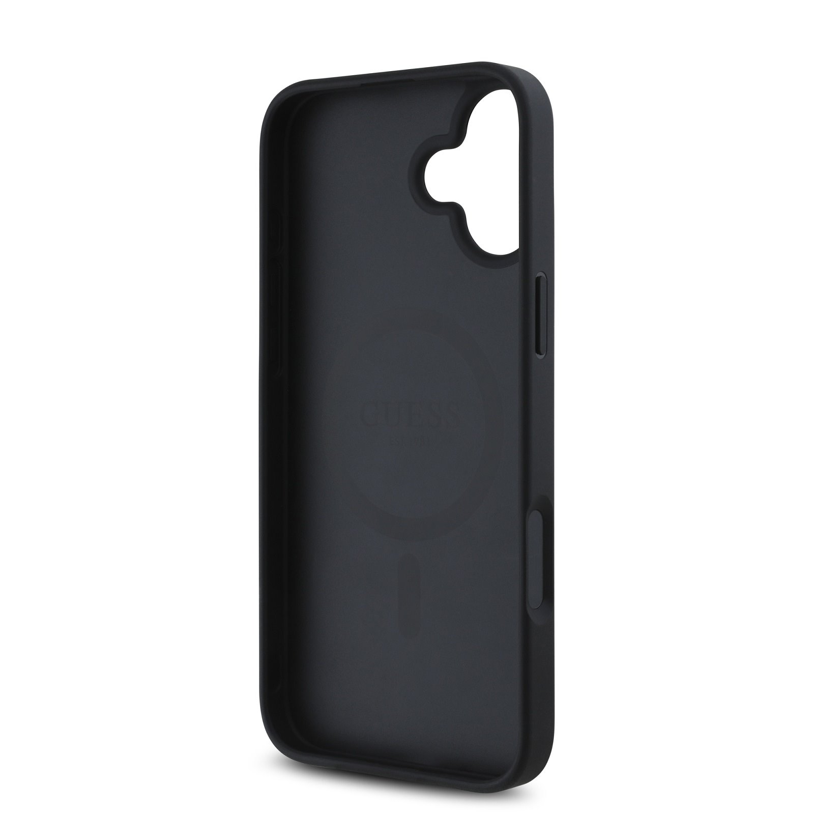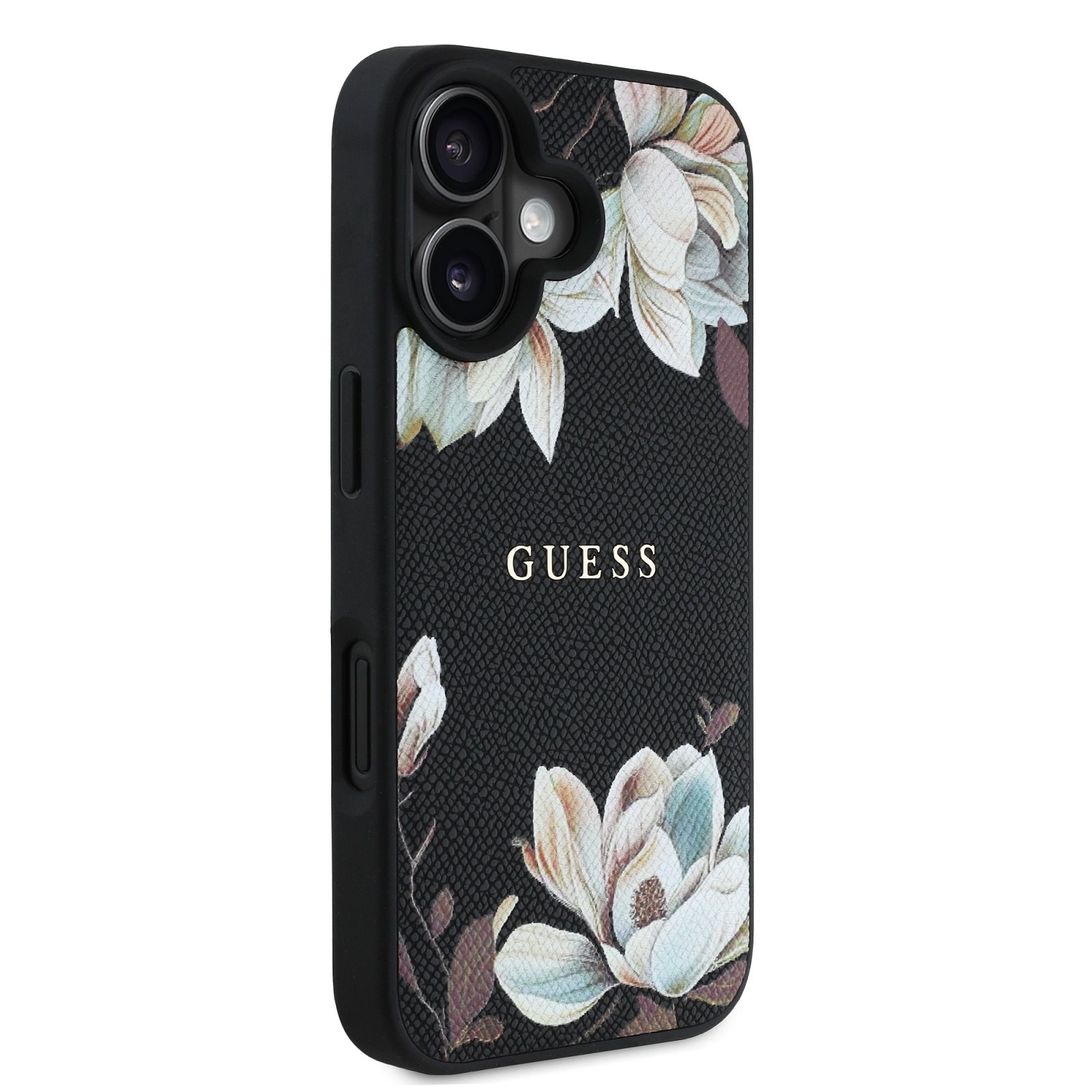 Juodas dėklas Apple Iphone 16 „Guess PU Grained Magnolia MagSafe”