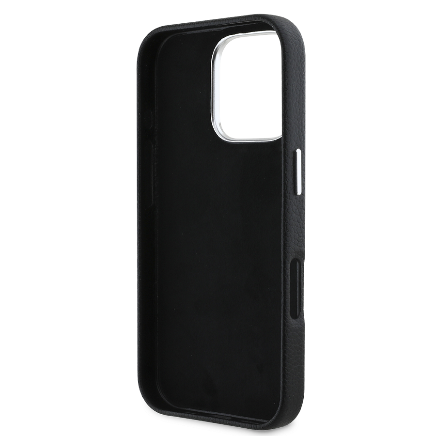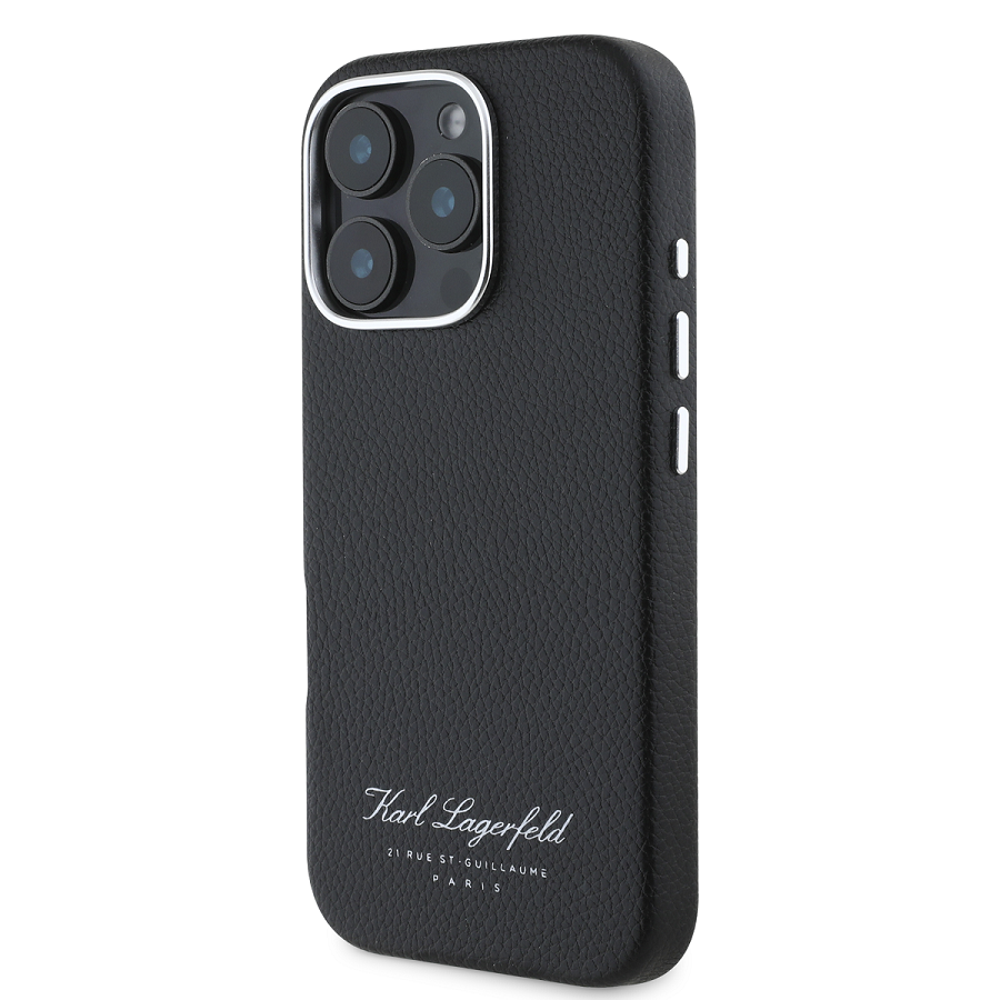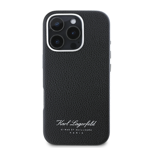 Juodas dėklas Karl Lagerfeld Grained PU Hotel RSG – aukščiausios kokybės dangtelis, puikiai apsaugantis Apple iPhone 16 Pro telefoną ir pasižymintis išskirtiniu dizainu.