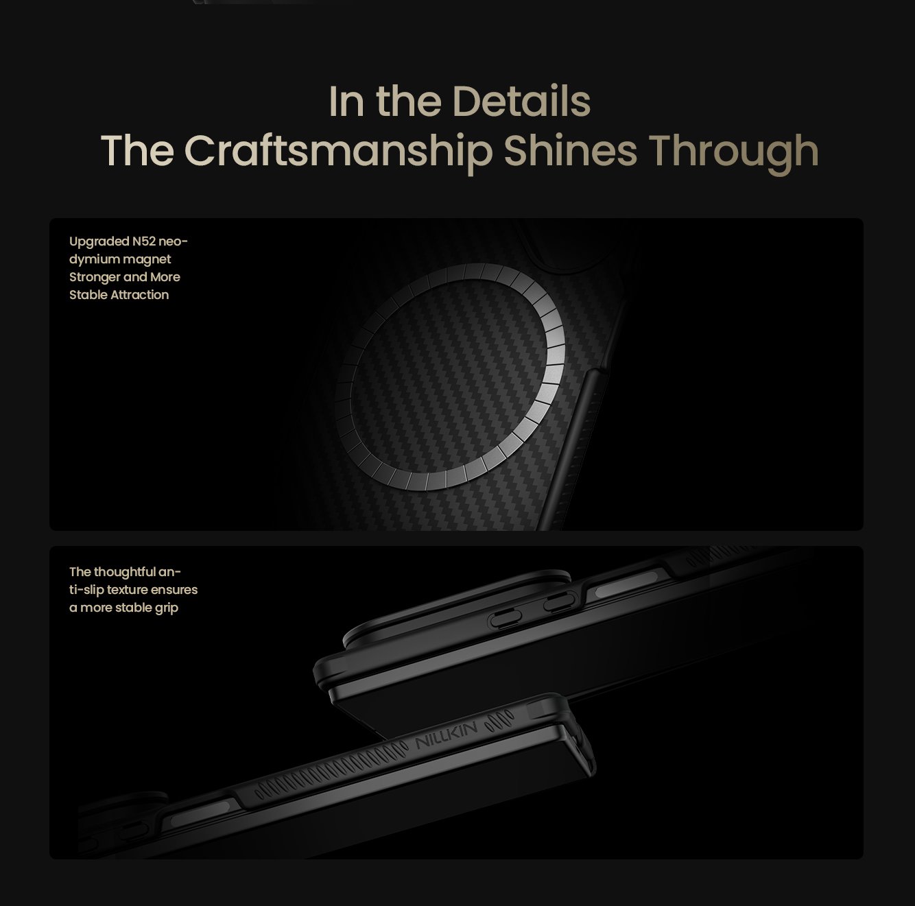 Juodas dėklas Nillkin CarboProp išsiskiria savo aramidiniu pluoštu, žinomu kaip „juodasis auksas”, ir suteikia išskirtinę apsaugą jūsų Samsung Galaxy Z Fold 7 telefonui.