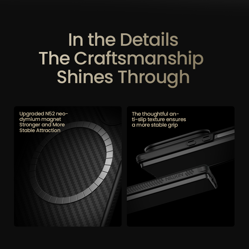 Nillkin CarboProp Aramid Magnetic dėklas yra pagamintas iš aramidinio pluošto, žinomo kaip „juodasis auksas” medžiagų pramonėje, užtikrinantis aukštą apsaugos lygį jūsų įrenginiui.