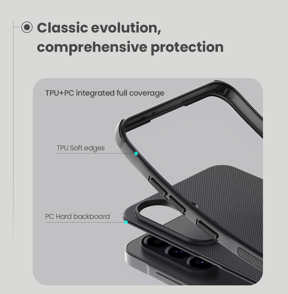 Juodas dėklas Samsung Galaxy A56 5G Super Frosted PRO Magnetic iš Nillkin prekės ženklo yra aukščiausios kokybės apsauga su integruotu magnetu Apple MagSafe priedams.