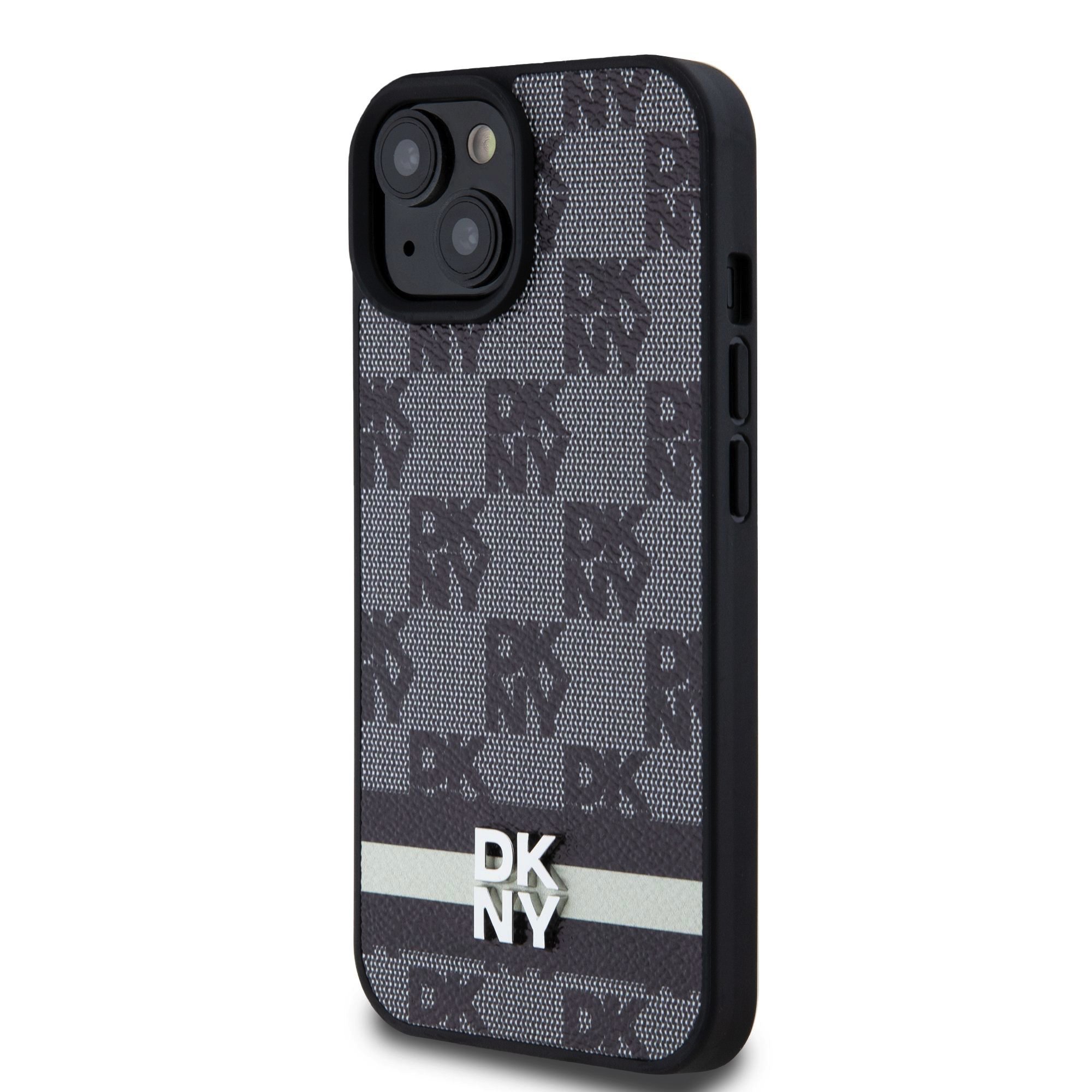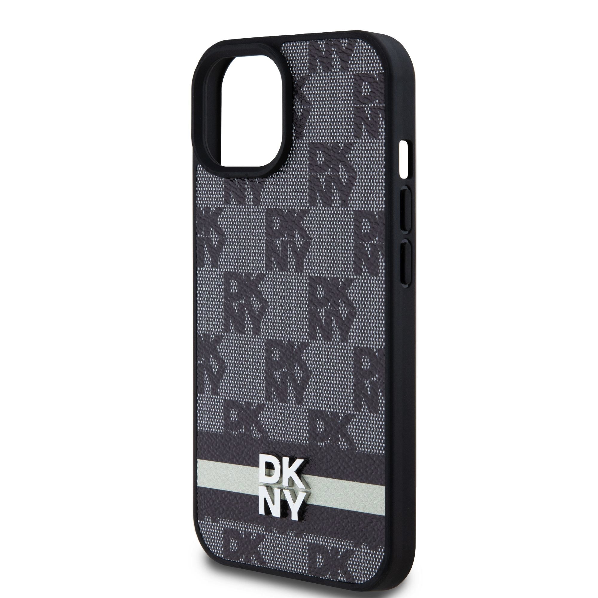 Juodas dėklas telefonui Apple Iphone 15 „DKNY PU Leather Checkered Pattern and Stripe”