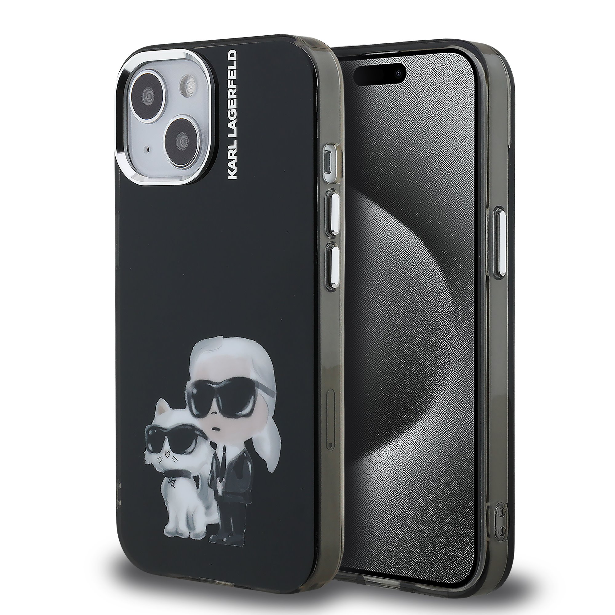 Juodas dėklas telefonui Apple Iphone 15 „Karl Lagerfeld IML Aquarelle Karl and Choupette”