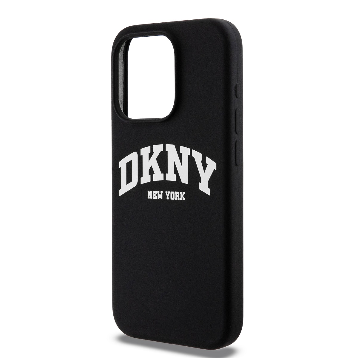 DKNY Liquid Silicone Arch Logo MagSafe yra juodas dėklas telefonui Apple iPhone 15 Pro, pagamintas iš aukščiausios kokybės silikono, kuris puikiai prisitaiko prie jūsų telefono formos.