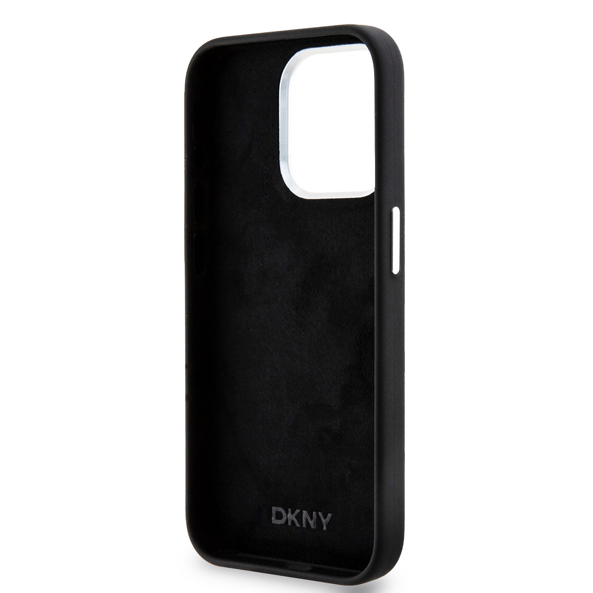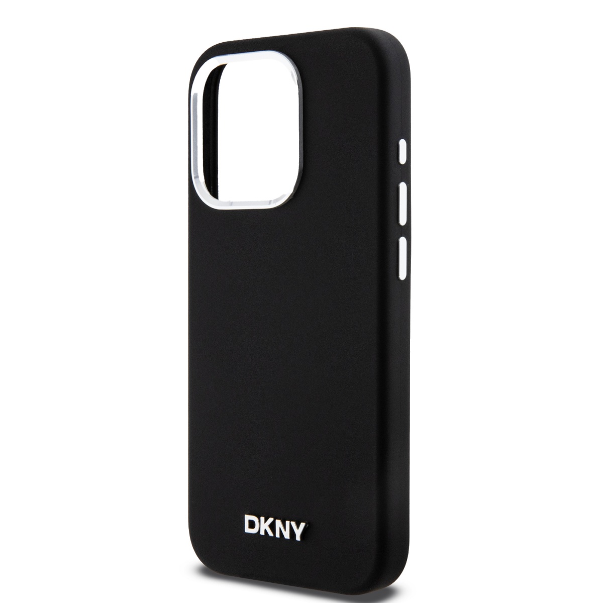 Juodas dėklas telefonui Apple Iphone 15 Pro DKNY Liquid Silicone Silver Metal Logo Magsafe yra lengvas ir patvarus dėklas, pagamintas iš aukščiausios kokybės silikono, kuris puikiai prisitaiko prie jūsų telefono formos.