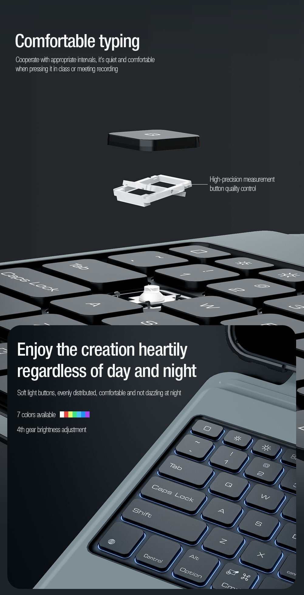 Dangtelis jums pasiūlys aukščiausios kokybės belaidę klaviatūrą su žemu pakėlimu, tyliais ir patvariais jungikliais bei tiksliu klavišų profiliavimu, kad būtų patogiau rašyti.