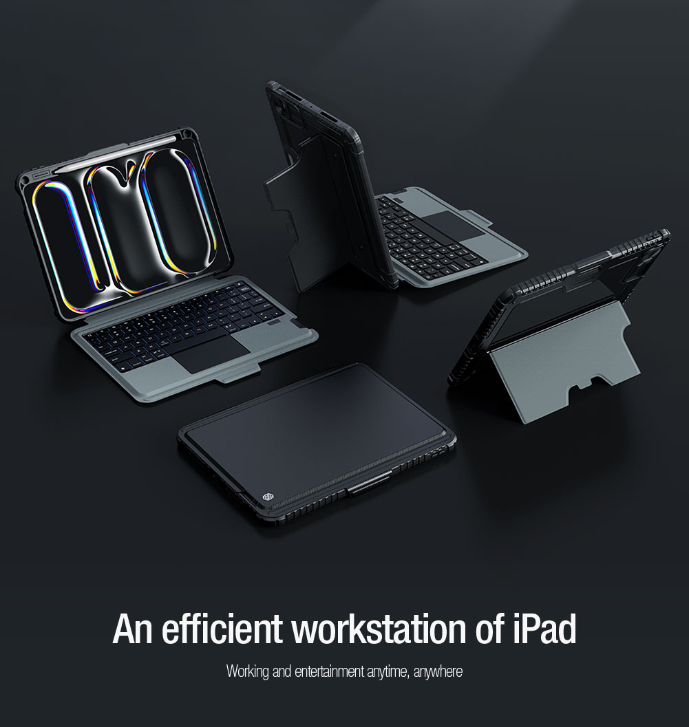 Juodas dėklas telefonui iPad Pro 11 2024 Nillkin Bumper Combo Keyboard yra universalus planšetinio kompiuterio apsauginis dangtelis su apšviesta klaviatūra, Apple Pencil lizdu su automatiniu įkrovimu ir nuolat reguliuojamu planšetinio kompiuterio kampu.