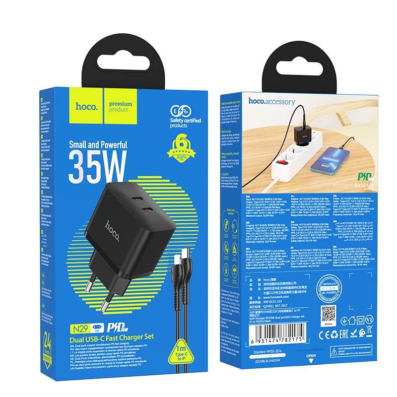 Juodas įkroviklis buitinis Hoco N29 PD35W pasižymi aukšta kokybe ir efektyvumu, tinkamas įvairiems įrenginiams su Type-C jungtimis.