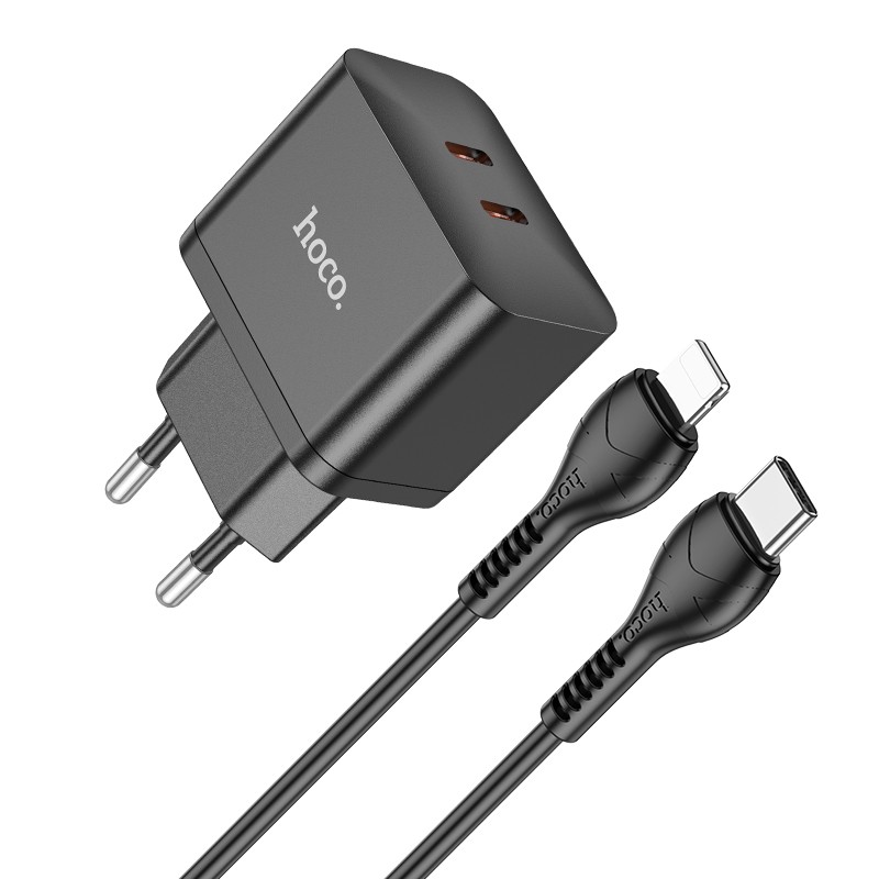 Juodas įkroviklis buitinis Hoco N29 PD35W su dviem Type-C jungtimis + Lightning