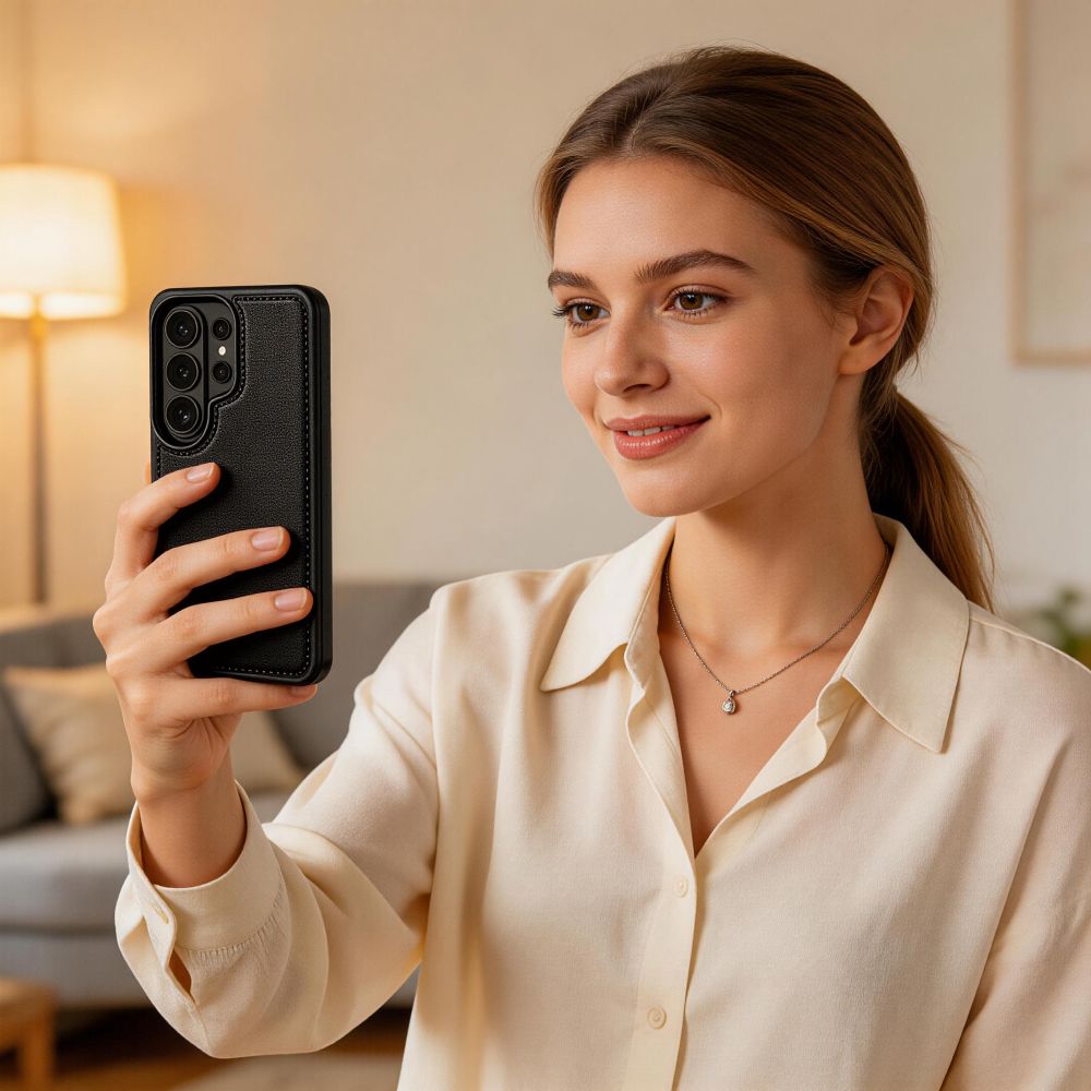 Magnetinis užsegimas leidžia greitai ir lengvai uždaryti ir atidaryti dėklą, o telefonas yra saugiai ir patikimai laikomas viduje.