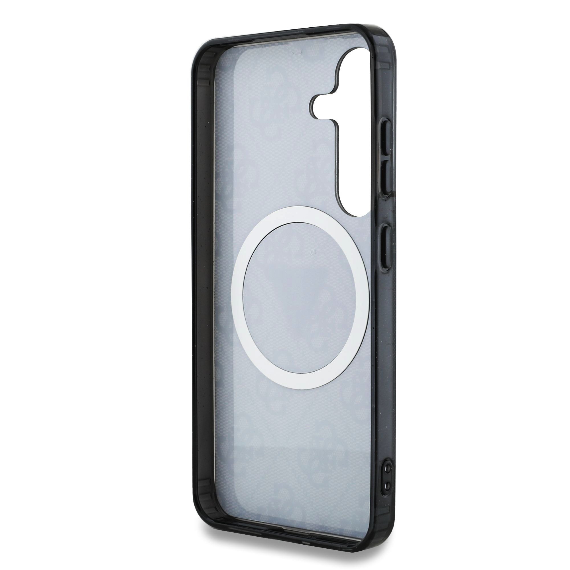 Juodas originalus dėklas Guess IML 4G Glitter and Triangle Logo MagSafe telefonui Samsung Galaxy S25