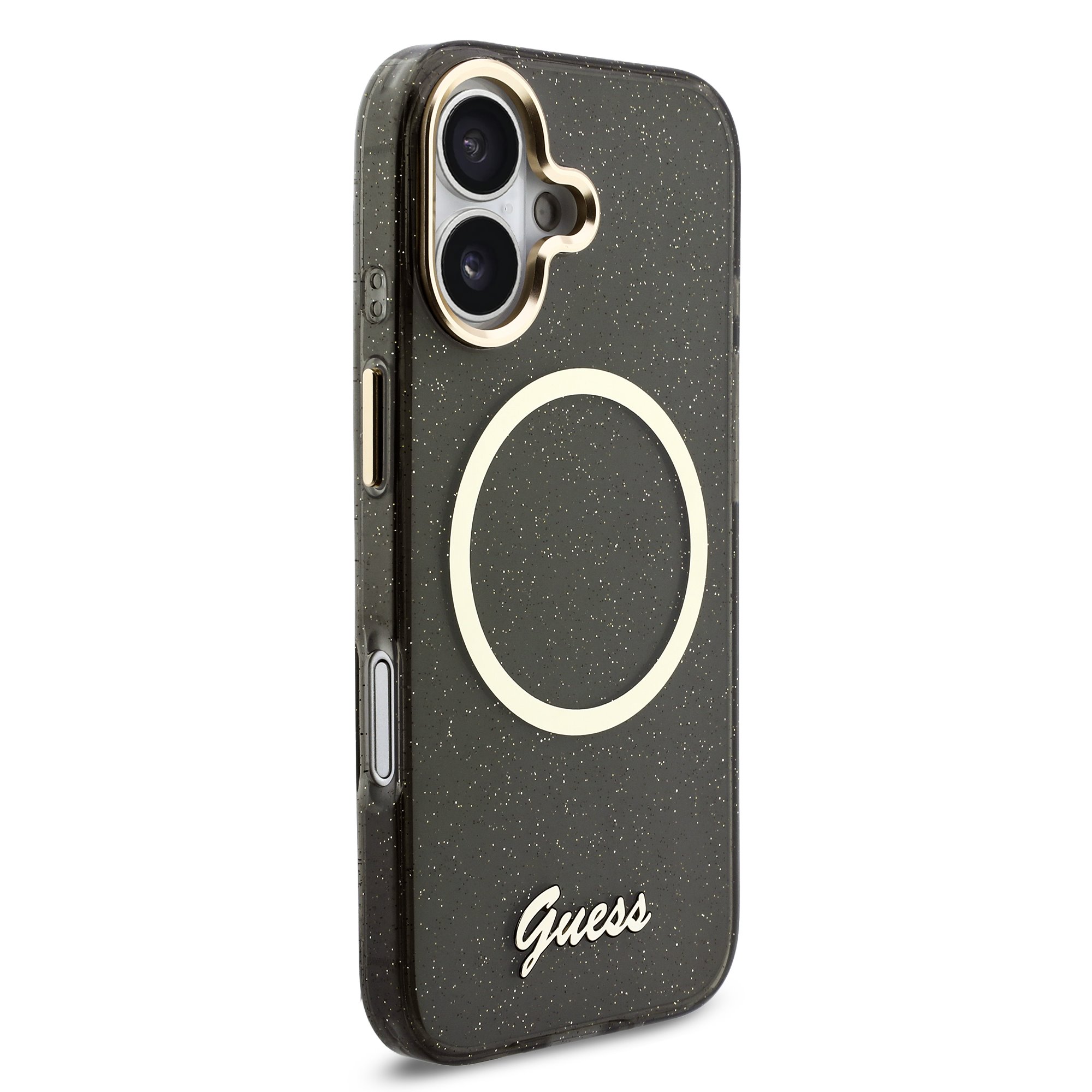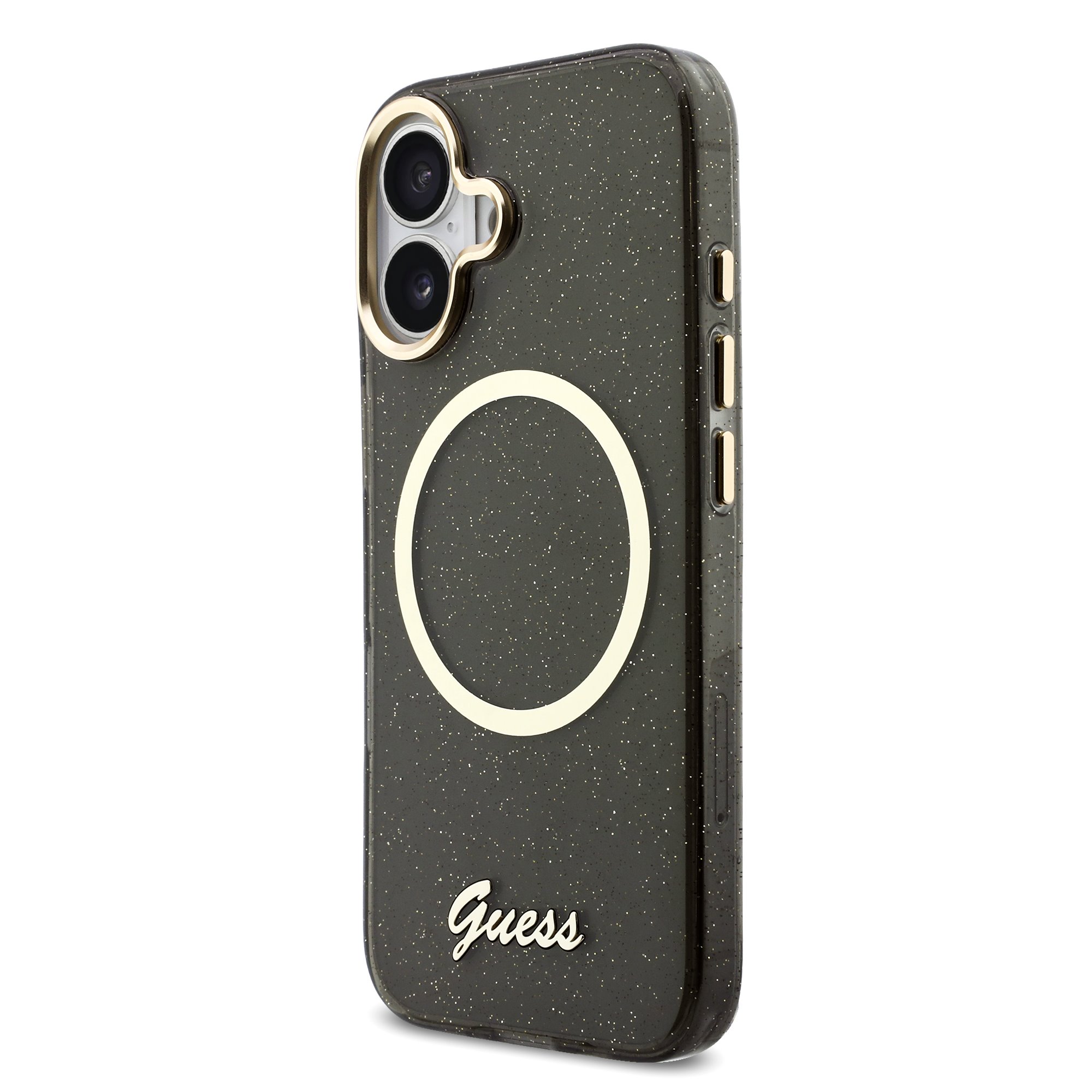 Juodas originalus dėklas Guess IML Glitter Script Strap MagSafe telefonui Apple Iphone 17