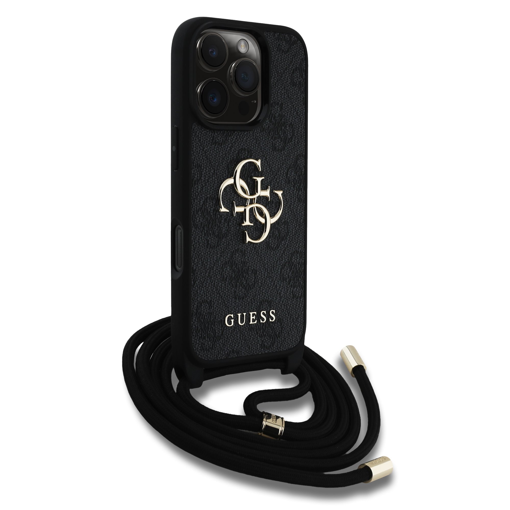 Juodas originalus dėklas Guess PU 4G Metal Logo Crossbody Strap telefonui Apple iPhone 16 Pro