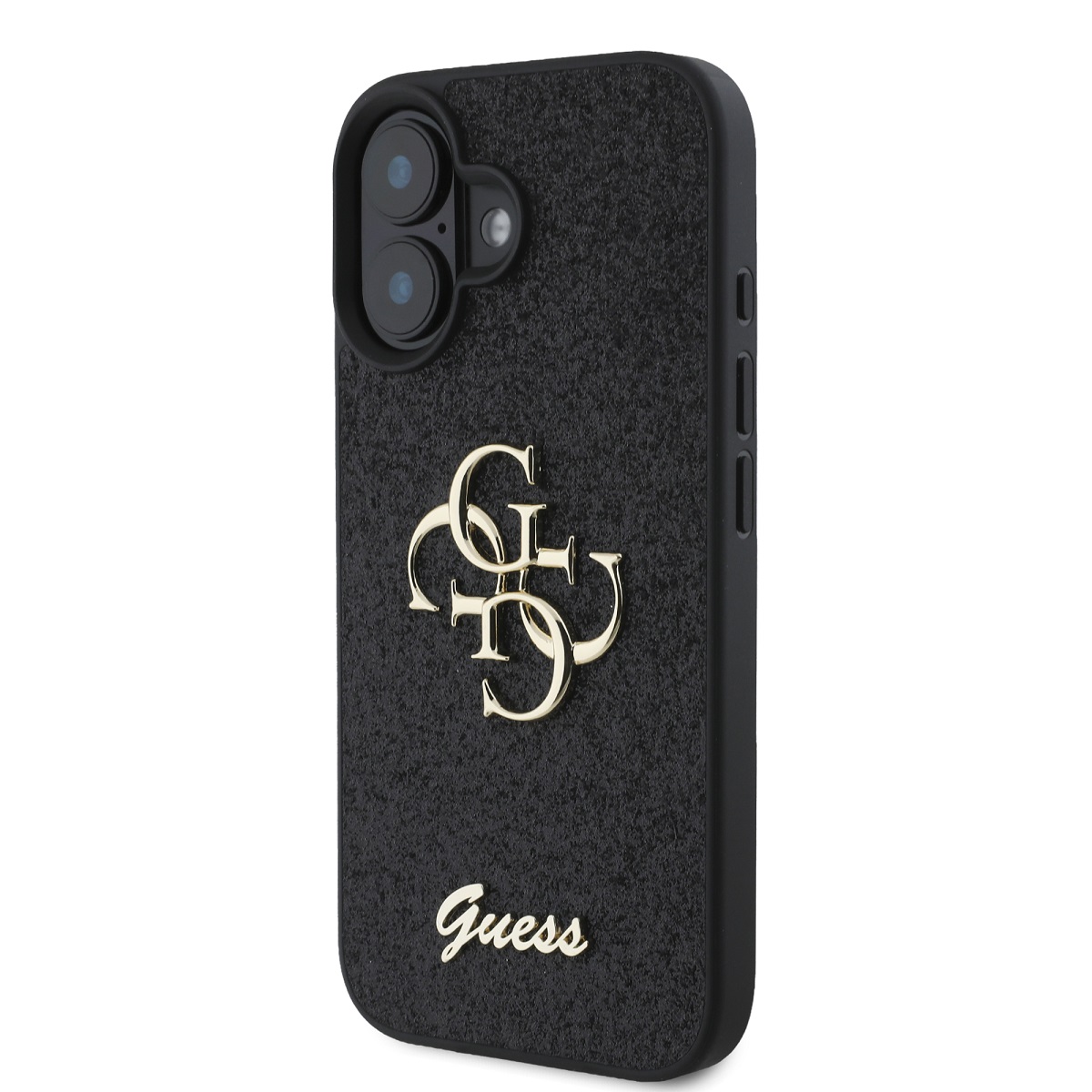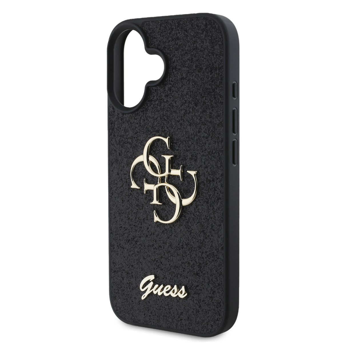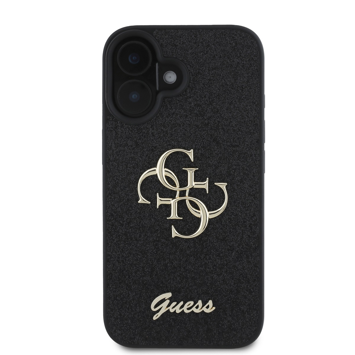 Juodas dėklas Apple iPhone 16 Guess PU Fixed Glitter 4G Metal Logo yra elegantiška ir patikima apsauga jūsų telefonui.