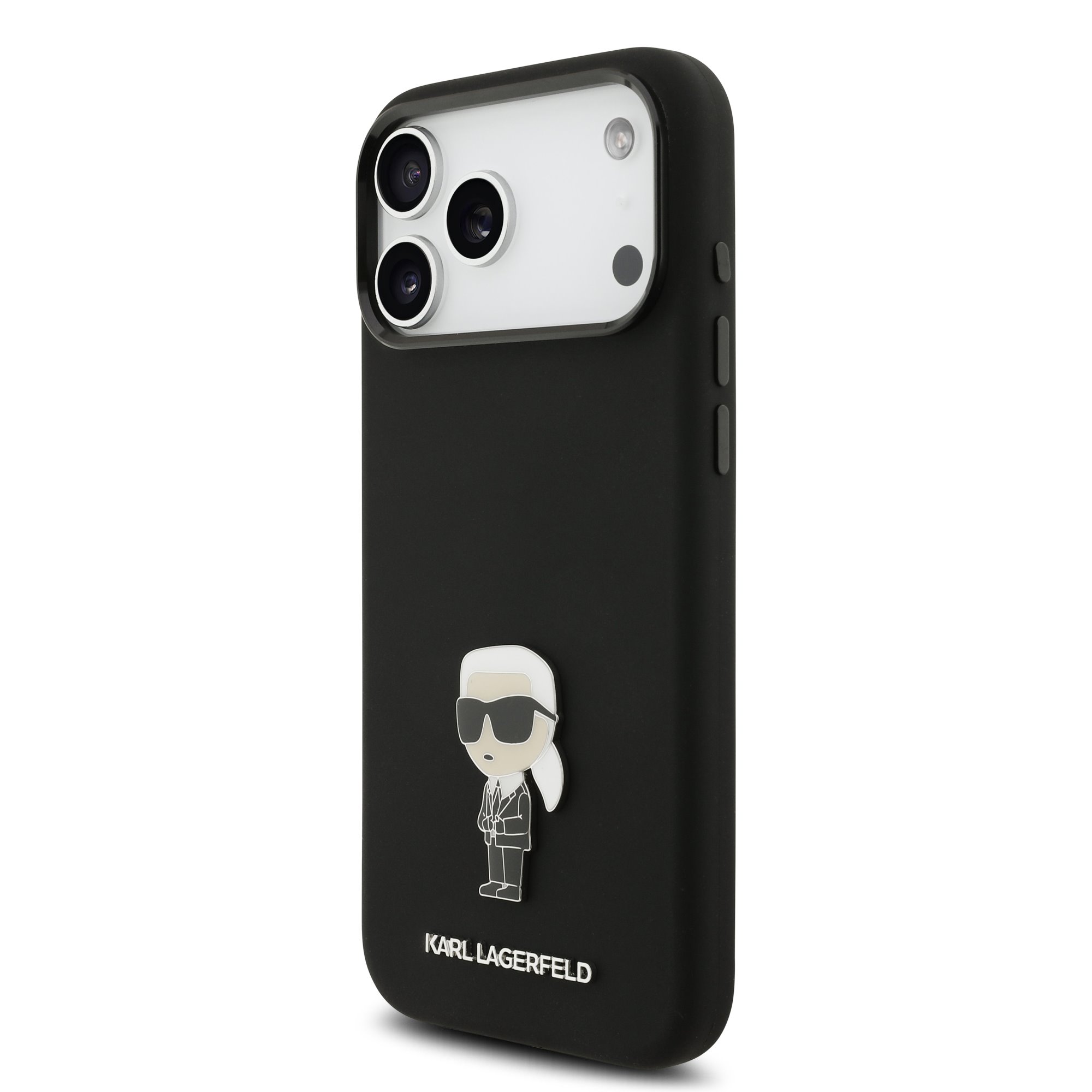Juodas originalus dėklas Karl Lagerfeld Liquid Silicone Metal Ikonik telefonui Apple iPhone 17 Pro Max