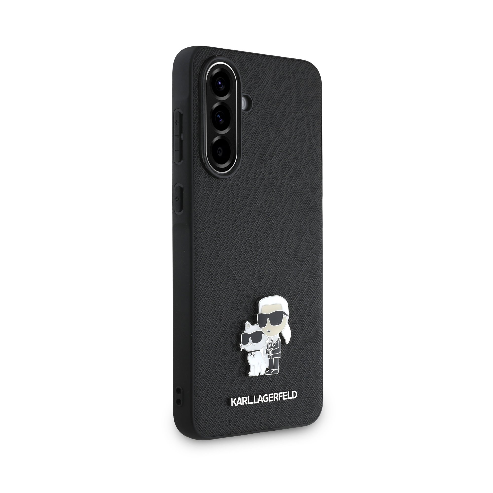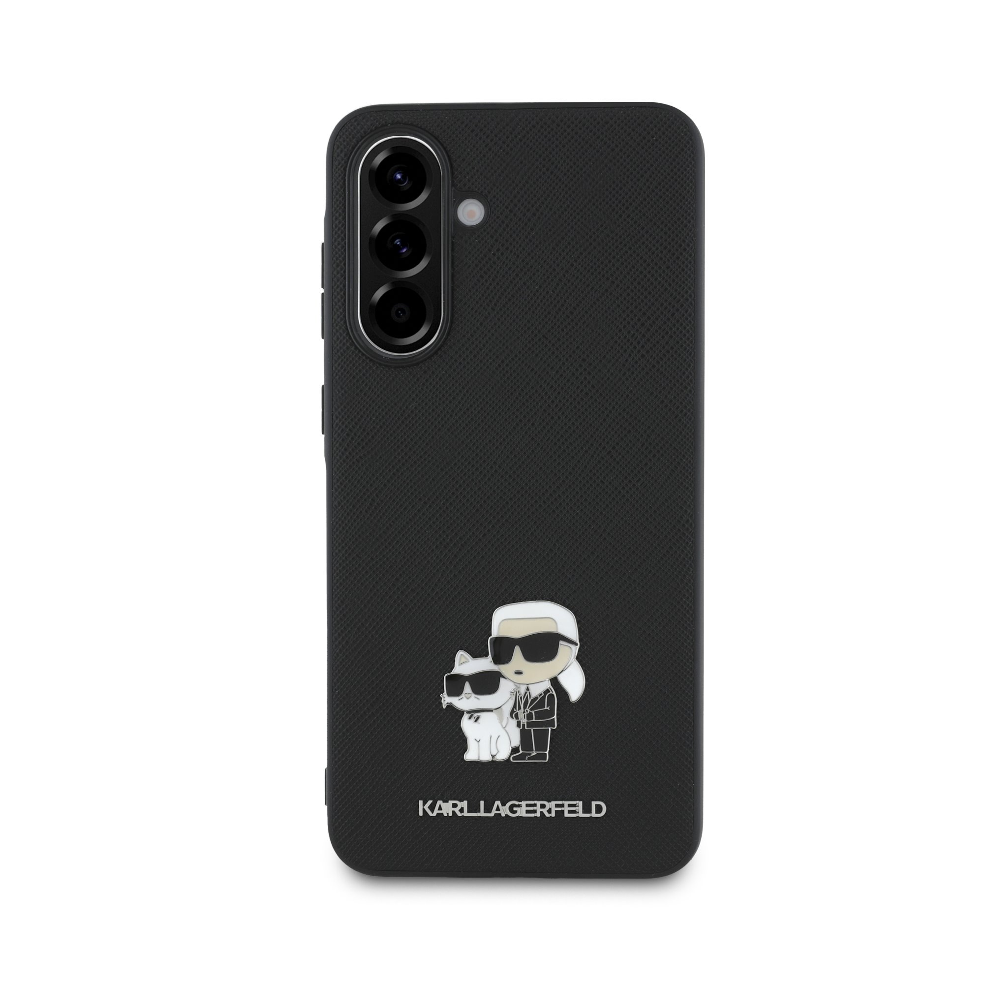 Juodas originalus dėklas Karl Lagerfeld PU Saffiano Metal Karl and Choupette telefonui Samsung Galaxy A36 5G