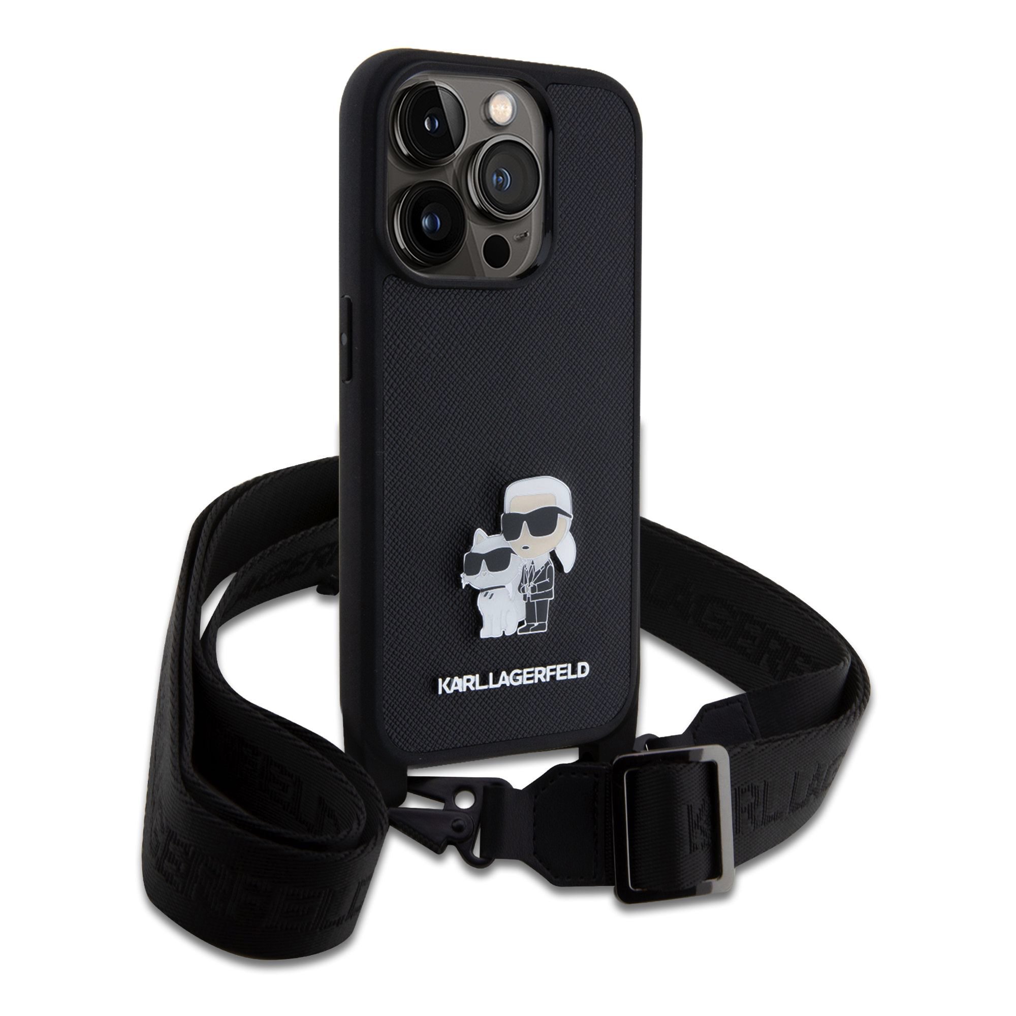 Juodas originalus dėklas Karl Lagerfeld Saffiano Crossbody Metal Karl and Choupette telefonui Apple iPhone 15 Pro