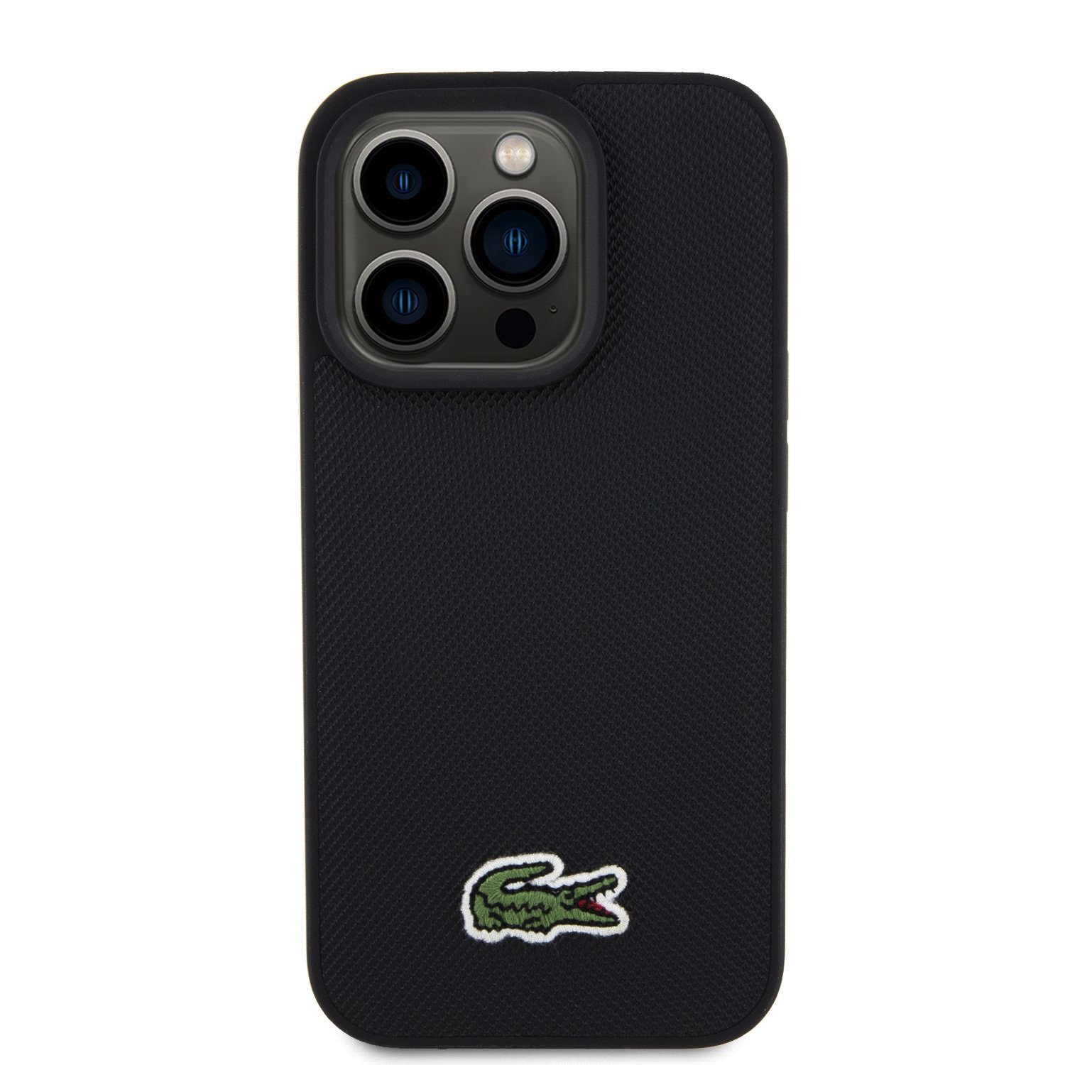Lacoste Iconic Petit Pique Woven Logo – Juodas originalus dėklas Lacoste, kuris derina dviejų medžiagų derinį ir suteikia tobulą apsaugą bei stilių jūsų Apple iPhone 15 Pro Max.