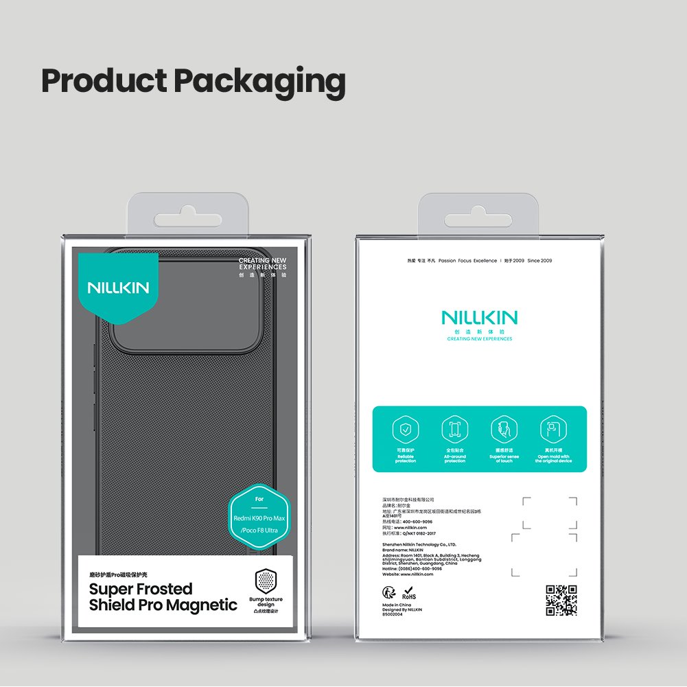 Juodas plastikinis dėklas Xiaomi Poco F8 Ultra yra Super Frosted PRO Magnetic nugaros apsauginis dangtelis iš Nillkin prekės ženklo su integruotu magnetu Apple MagSafe priedams.