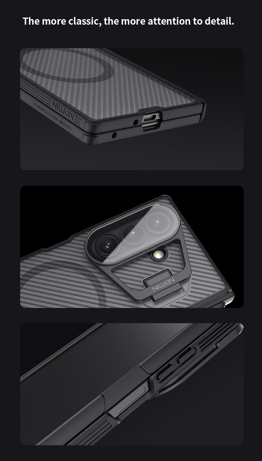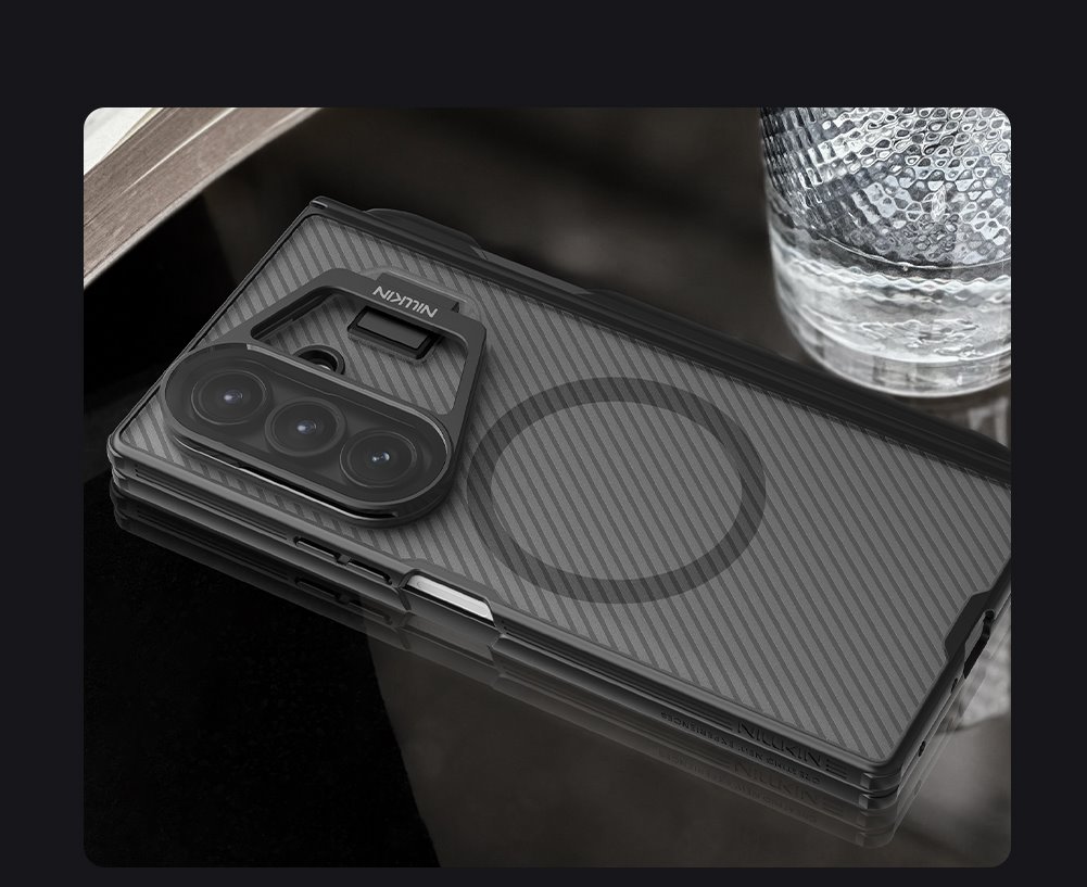 Nillkin CamShield Prop dėklas – unikalus galinis dangtelis su atlenkiamu kameros objektyvo dangteliu, skirtas Samsung Galaxy Z Fold 7 telefonui.