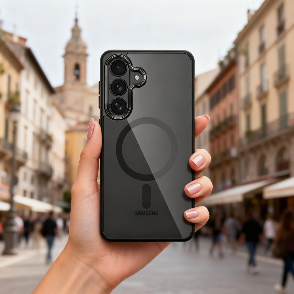 Žymų: Aksesuarai telefonui, Apsauginis dėklas, juodas dėklas, MagSafe dėklas, originalus dizainas, Samsung Galaxy S26, skaidrus dėklas, stilingas dėklas, Tech-Protect, telefono apsauga