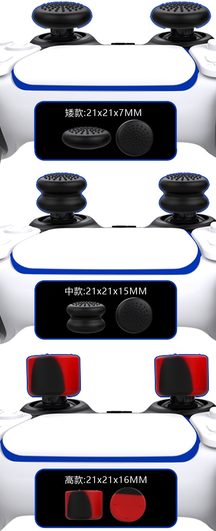 Galimi 7, 15 ir 16 mm aukščiai bei du paviršiai. Žemesnį dangtelį naudokite, jei jums netinka lygus svirties paviršius, o aukštą – didesniam jautrumui nukreipiant ir sukant.
