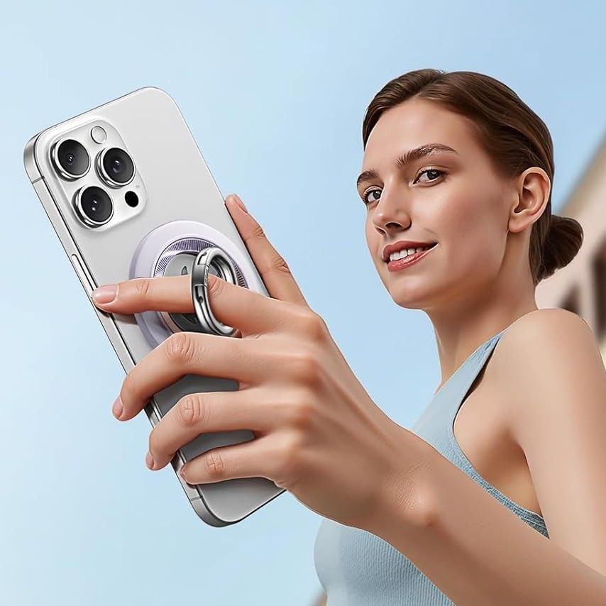 Stiprūs magnetai užtikrina stabilų ir saugų telefono pritvirtinimą prie metalinių paviršių, automobilio laikiklių ar treniruoklių, o neslystantis silikoninis žiedas užtikrina saugų ir patogų sukibimą.
