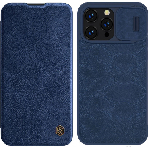Mėlynas atverčiamas dėklas Apple Iphone 14 Pro Nillkin Qin Pro Leather yra pagamintas iš aukštos kokybės PU odos, atsidaro į šoną kaip knyga, be to, lyginant su klasikine QIN Book, yra su slankiojančiu fotoaparato objektyvo dangteliu.