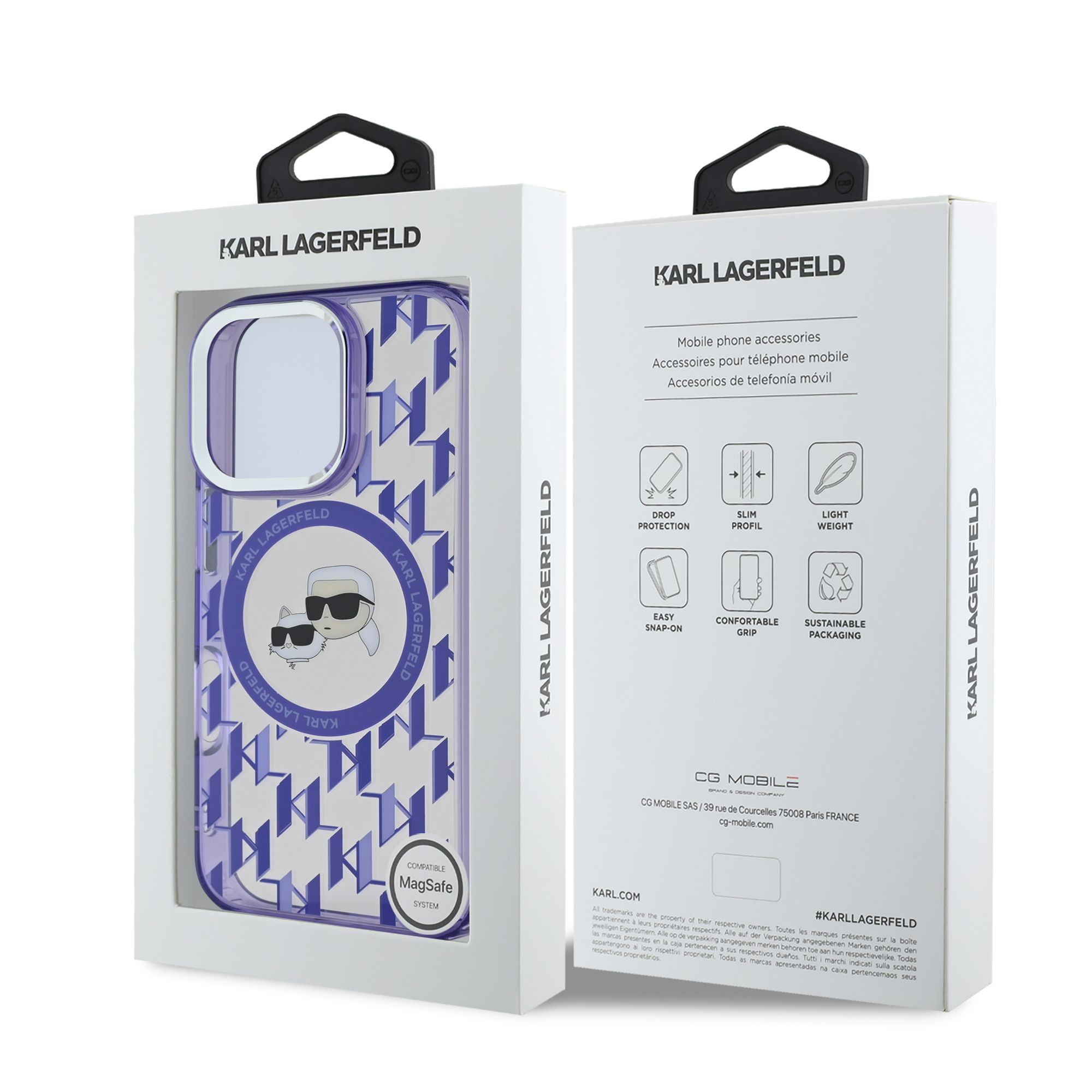 Purpurinis dėklas Karl Lagerfeld IML Monogram K&CH Heads MagSafe telefonui Apple iPhone 16 Pro yra stilingas ir funkcionalus pasirinkimas, derinantis apsaugą ir dizainą.
