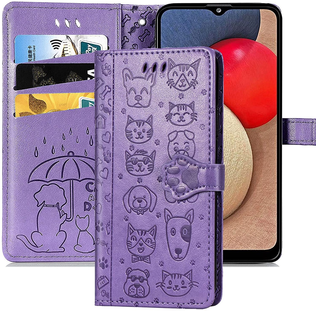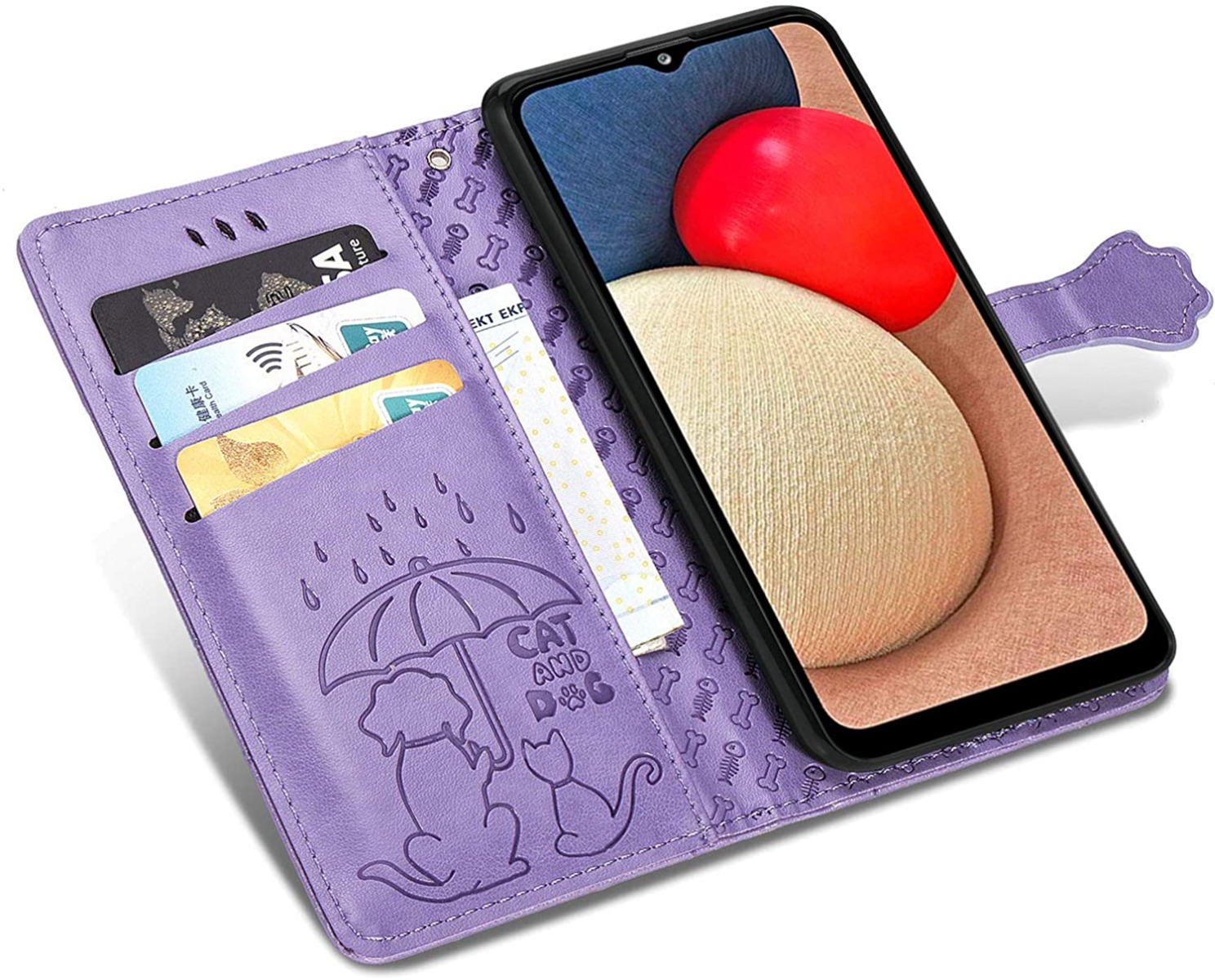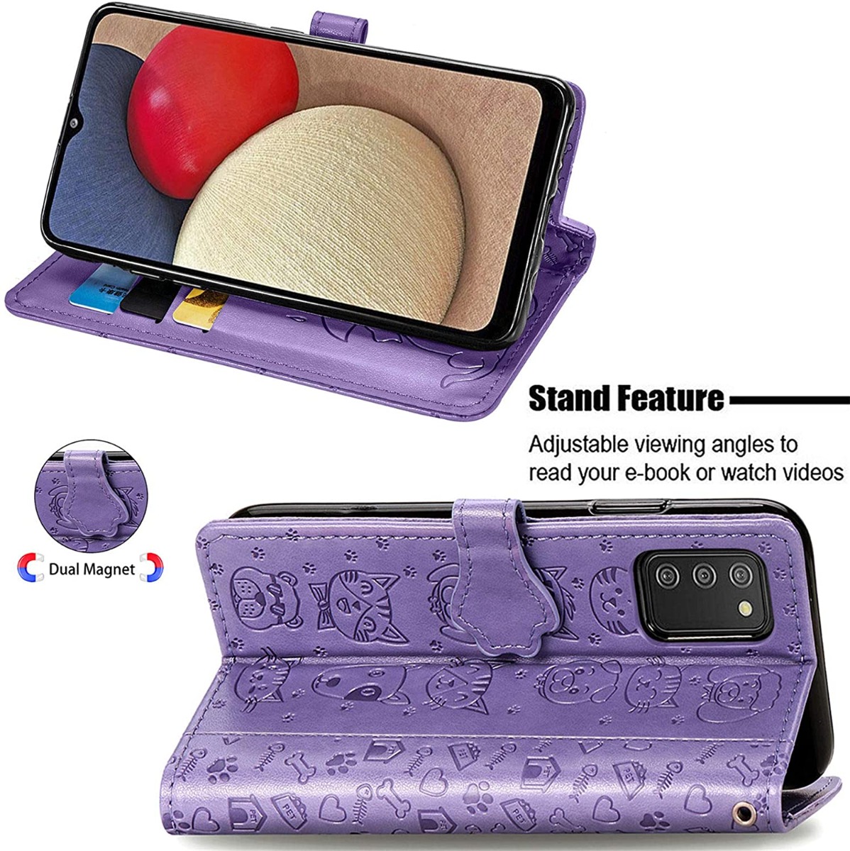 Žymos: A035 dėklas, A03s dėklas, Apsaugos dėklas, Cat-Dog dizainas, magnetinis dėklas, purpurinis dėklas, Samsung Galaxy dėklas, stovas telefonui, telefono dėklas