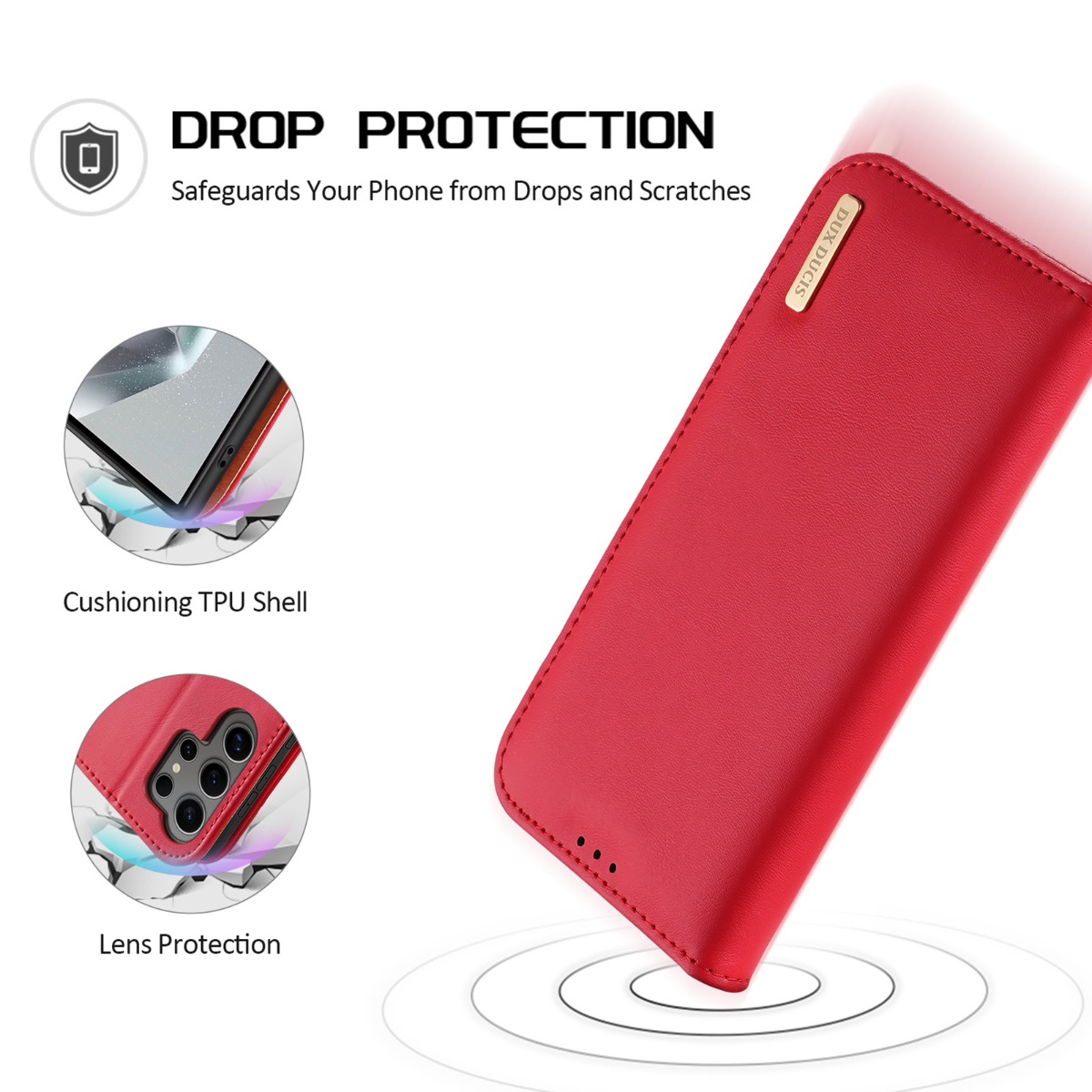Raudonas atverčiamas dėklas Samsung S928 S24 Ultra pagamintas iš natūralios odos su RFID blokuojančia medžiaga, apsaugančia asmeninę nuosavybę ir informaciją nuo vagystės.