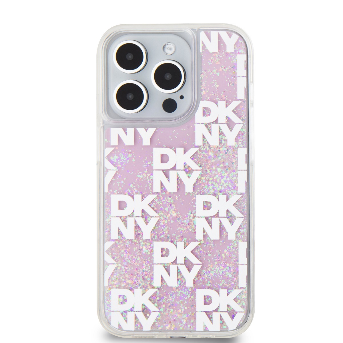 Rausvas blizgantis dėklas telefonui Apple Iphone 15 Pro „DKNY Liquid Glitter Checkered Pattern” yra madinga ir stilinga apsauga jūsų telefonui!