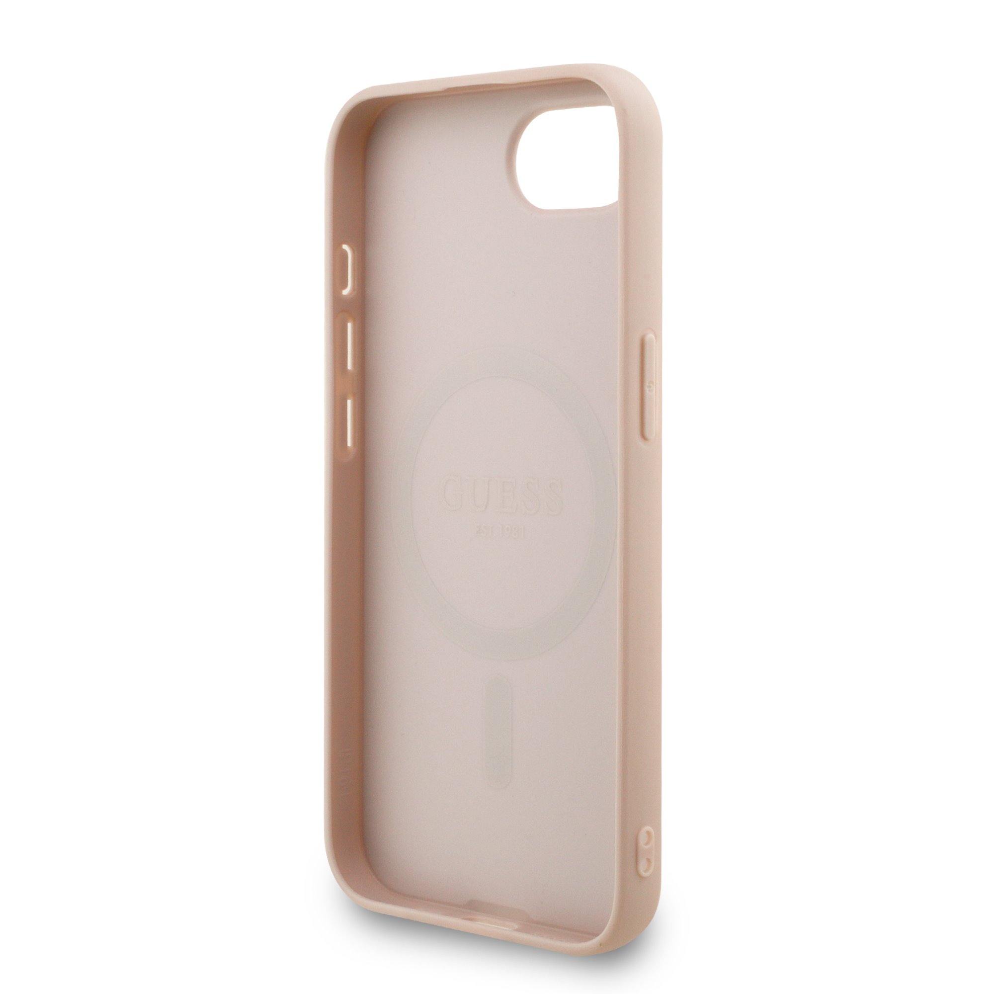 Rausvas dėklas Guess PU Leather 4G Colored Ring Strap MagSafe telefonui Apple Iphone 16e yra puikus aksesuaras jūsų telefonui ir aprangai, apjungiantis funkcionalumą ir stilių.
