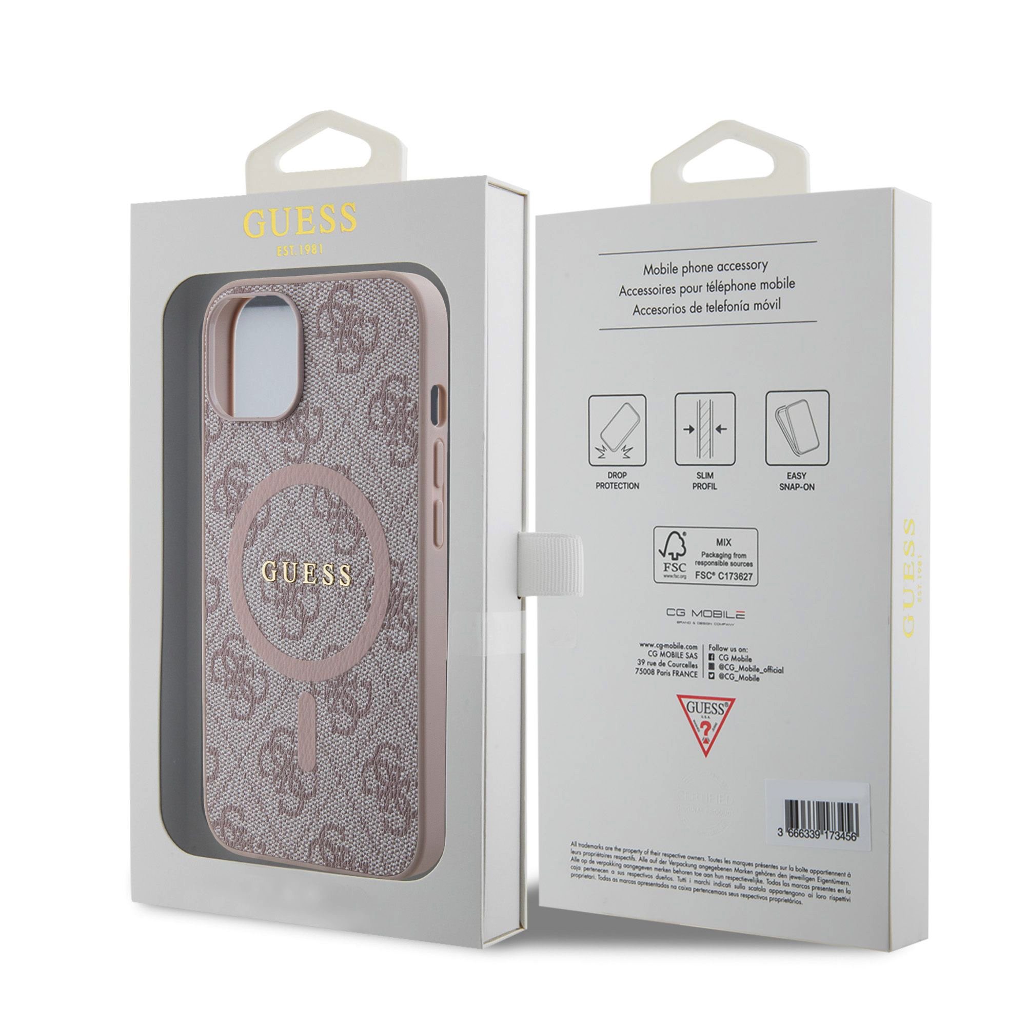Aukščiausios kokybės Rausvas originalus dėklas Guess 4G pasižymi elegantišku 4G raštu ir auksiniu GUESS logotipu. Tai ne tik stilingas, bet ir funkcionalus pasirinkimas Apple Iphone 14 telefonui.