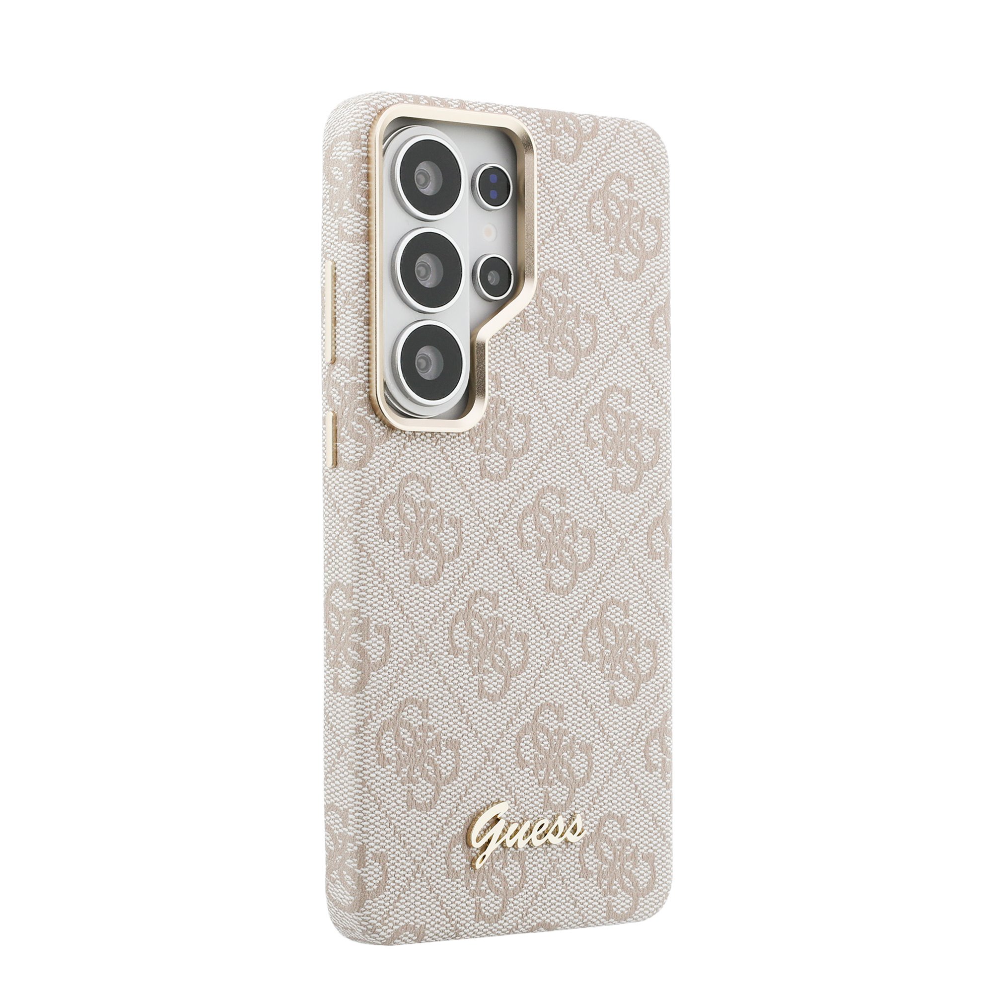 Rausvas originalus dėklas Guess PU 4G Script Metal Logo Magnetic telefonui Samsung Galaxy S26 Ultra