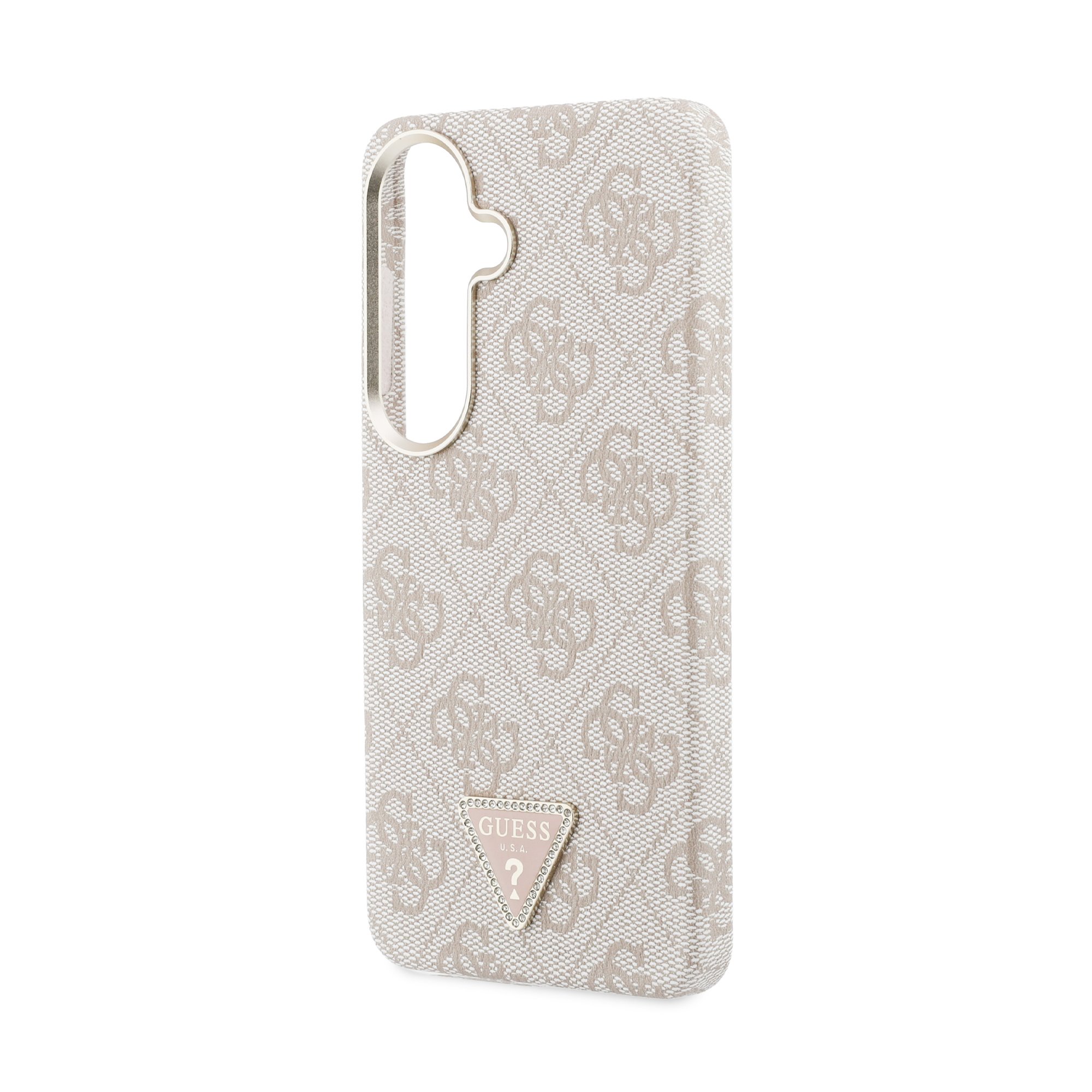Žymos: Auksinis rėmelis, dėklas Samsung S26, Guess, madingas dėklas, magnetinis dėklas, PU oda, Samsung Galaxy S26, telefono apsauga, trikampis logotipas