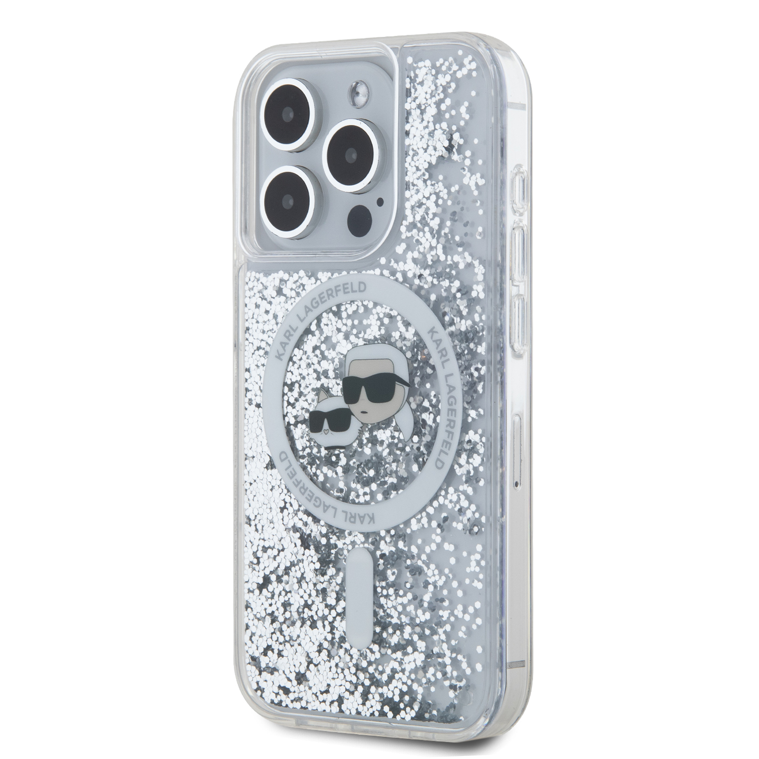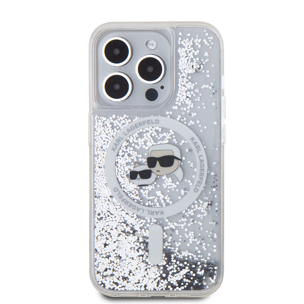 Skaidrus dėklas Apple Iphone 15 Pro Max Karl Lagerfeld Liquid Glitter Karl and Choupette Heads MagSafe – madinga ir stilinga apsauga jūsų telefonui!