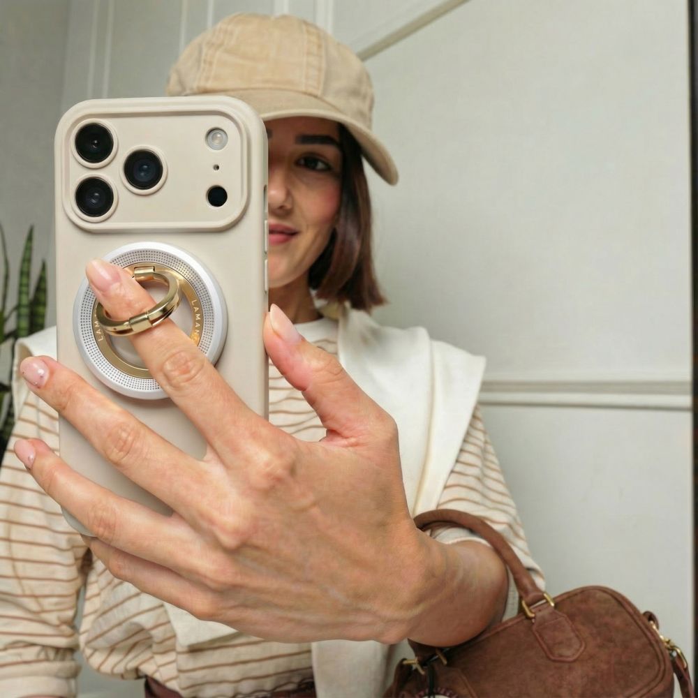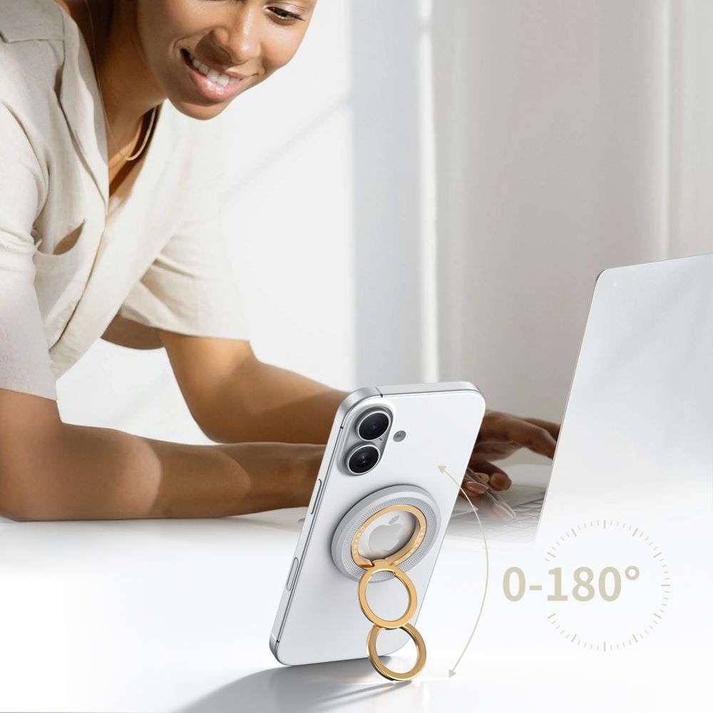 Žiedą galima laisvai pakreipti, todėl telefonas stabiliai stovi ant lygaus paviršiaus arba yra patogesnis laikyti rankoje.