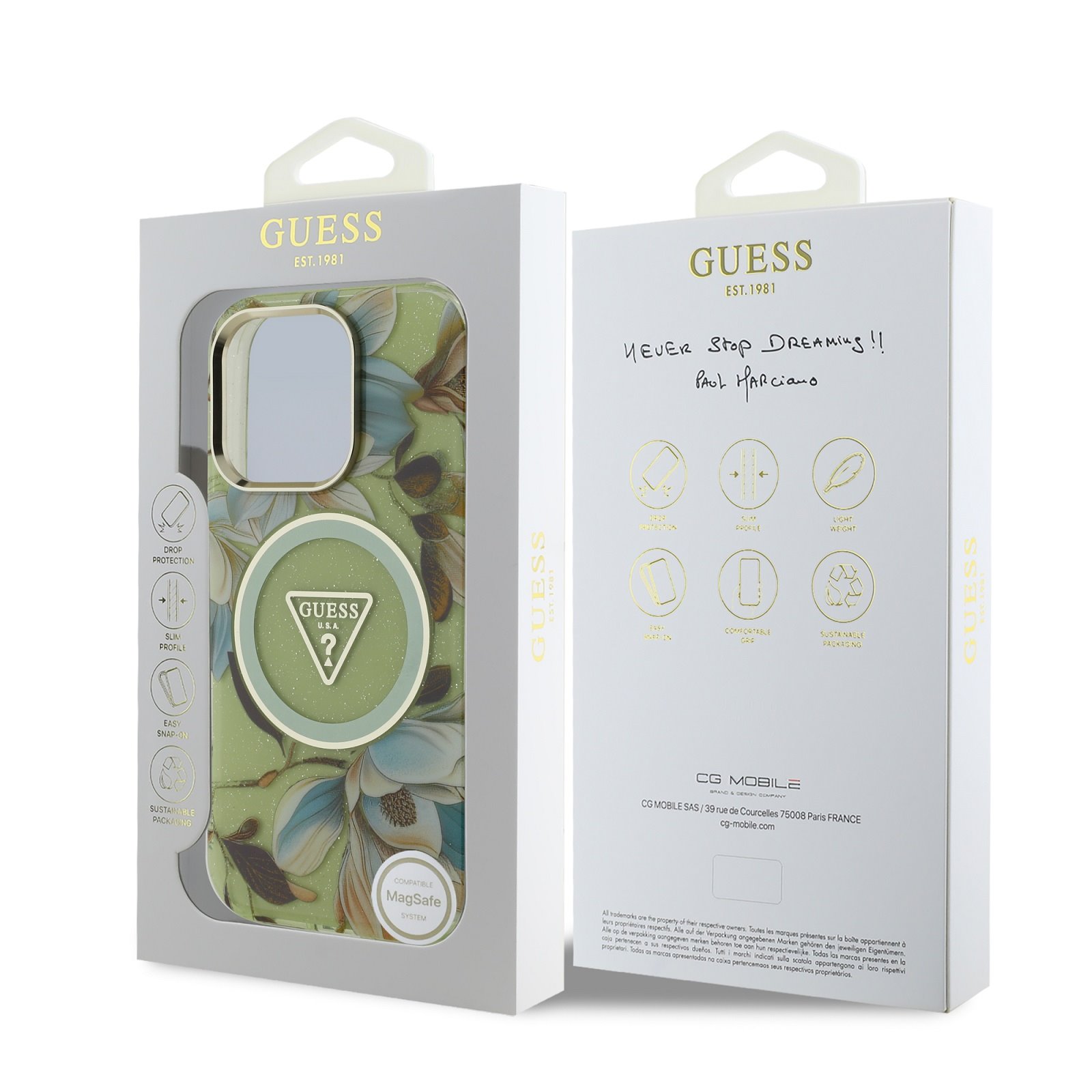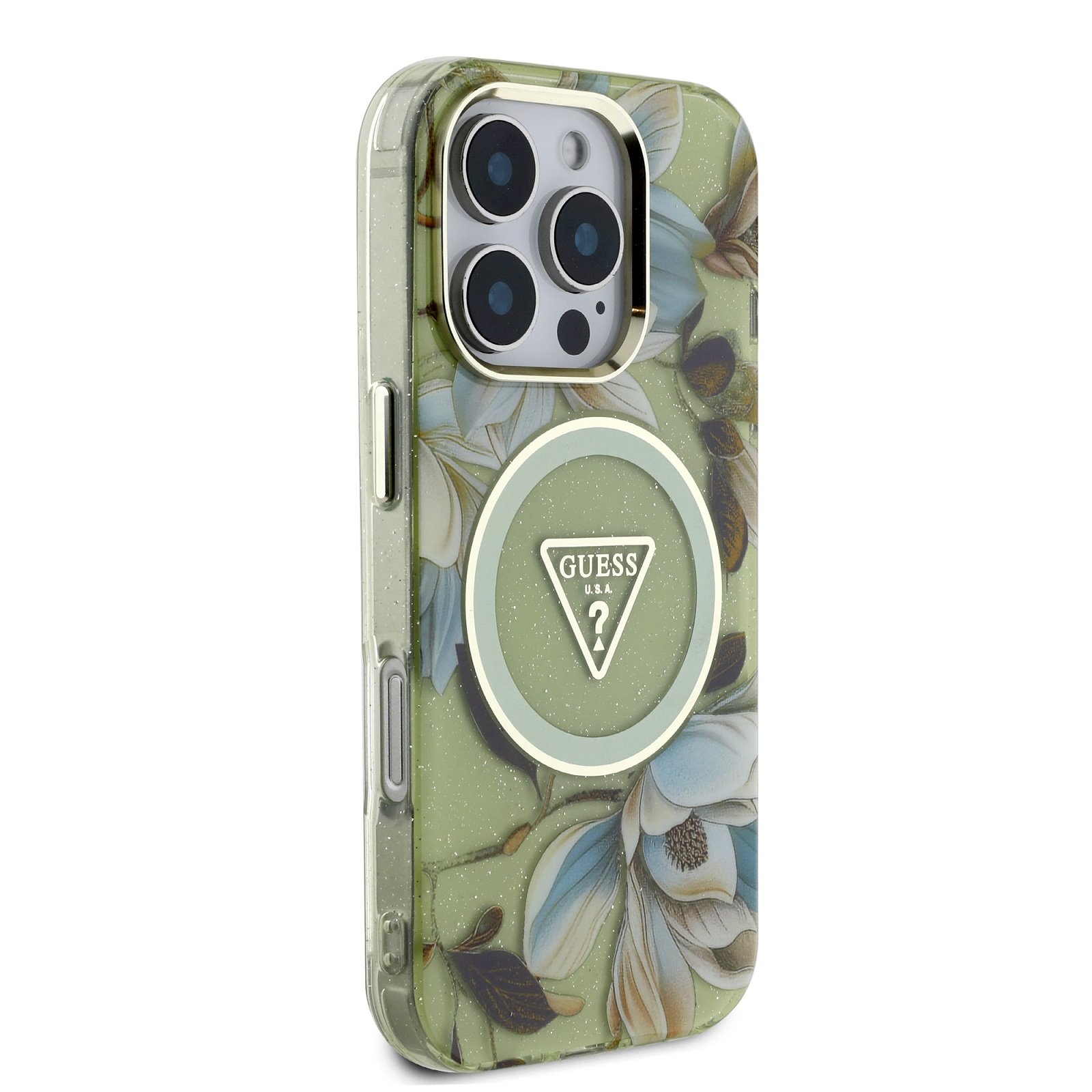 Žalias dėklas Guess IML Glitter Magnolia ir Triangle Logo MagSafe telefonui Apple iPhone 16 Pro Max yra puikus aksesuaras visiems stiliaus ir praktiškumo mėgėjams.